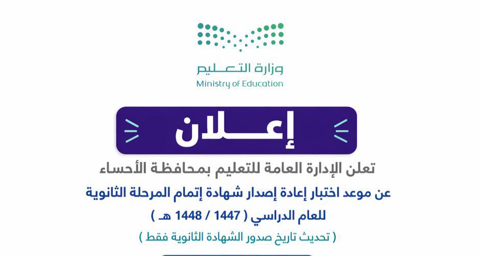 أعلنت الإدارة العامة للتعليم بمحافظة الأحساء، التابعة لـ وزارة التعليم، عن موعد اختبار إعادة إصدار شهادة إتمام المرحلة الثانوية للعام الدراسي 1447 / 1448هـ، وذلك ضمن إجراءات تحديث تاريخ صدور الشهادة فقط.