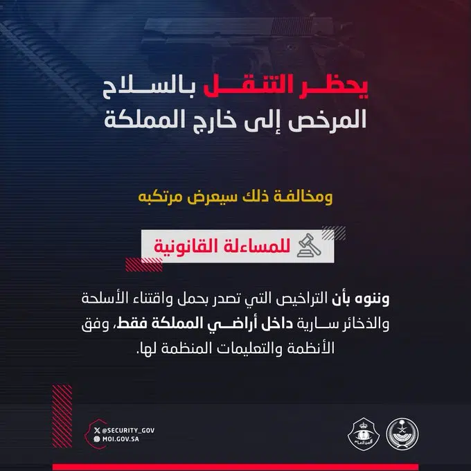 حذر الأمن العام، من التنقل بالسلاح المرخص إلى خارج المملكة، مشيرًا إلى أنه يعد مخالفة تعرّض مرتكبه للمساءلة القانونية.