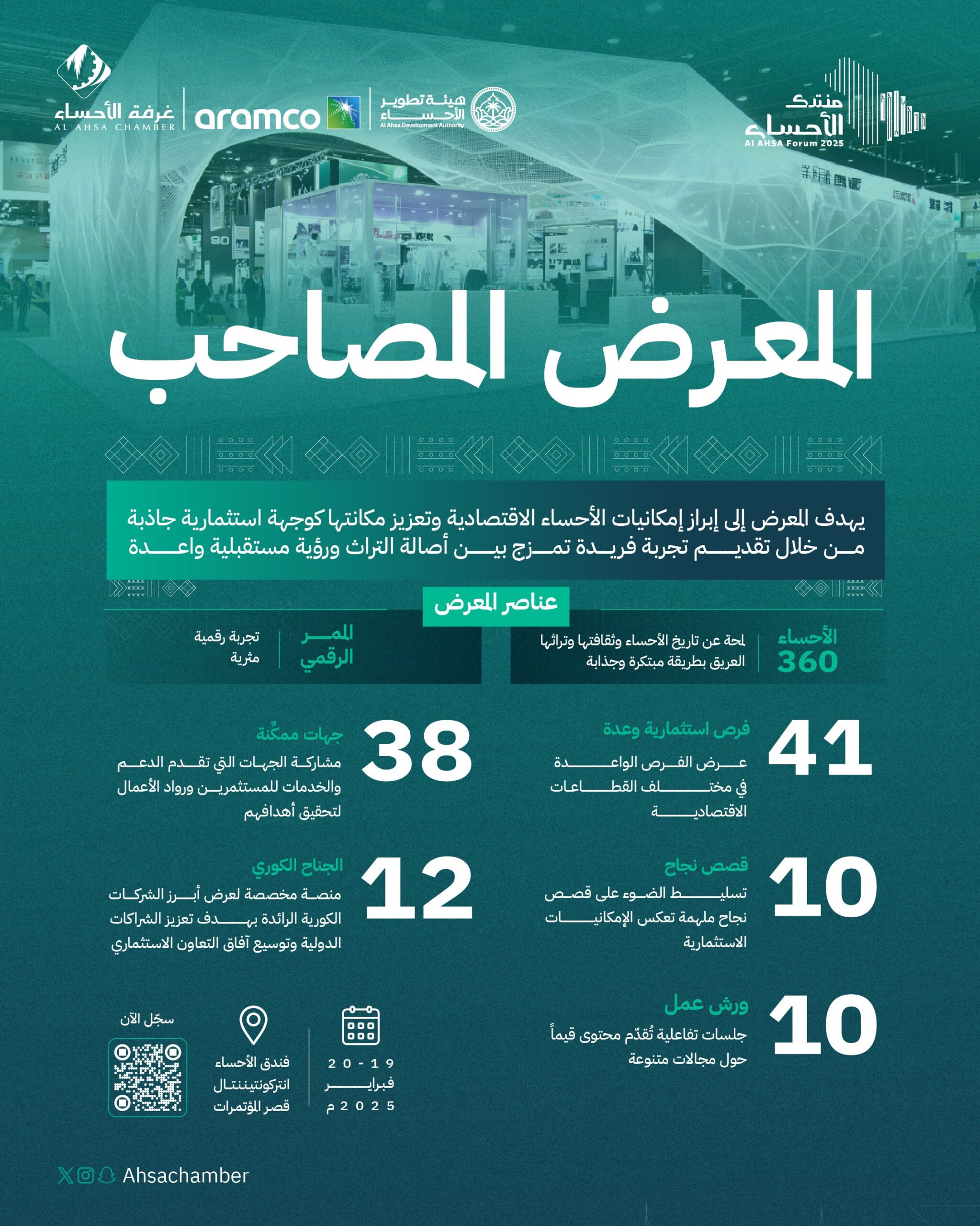 يعد المعرض المصاحب لـ منتدى الأحساء 2025 منصة لعرض أبرز المنتجات في الأحساء، وفتح أفق الفرص الاستثمارية التي تسهم في تعزيز النمو الاقتصادي المستدام، من خلال مشاركة 52 عارضًا.