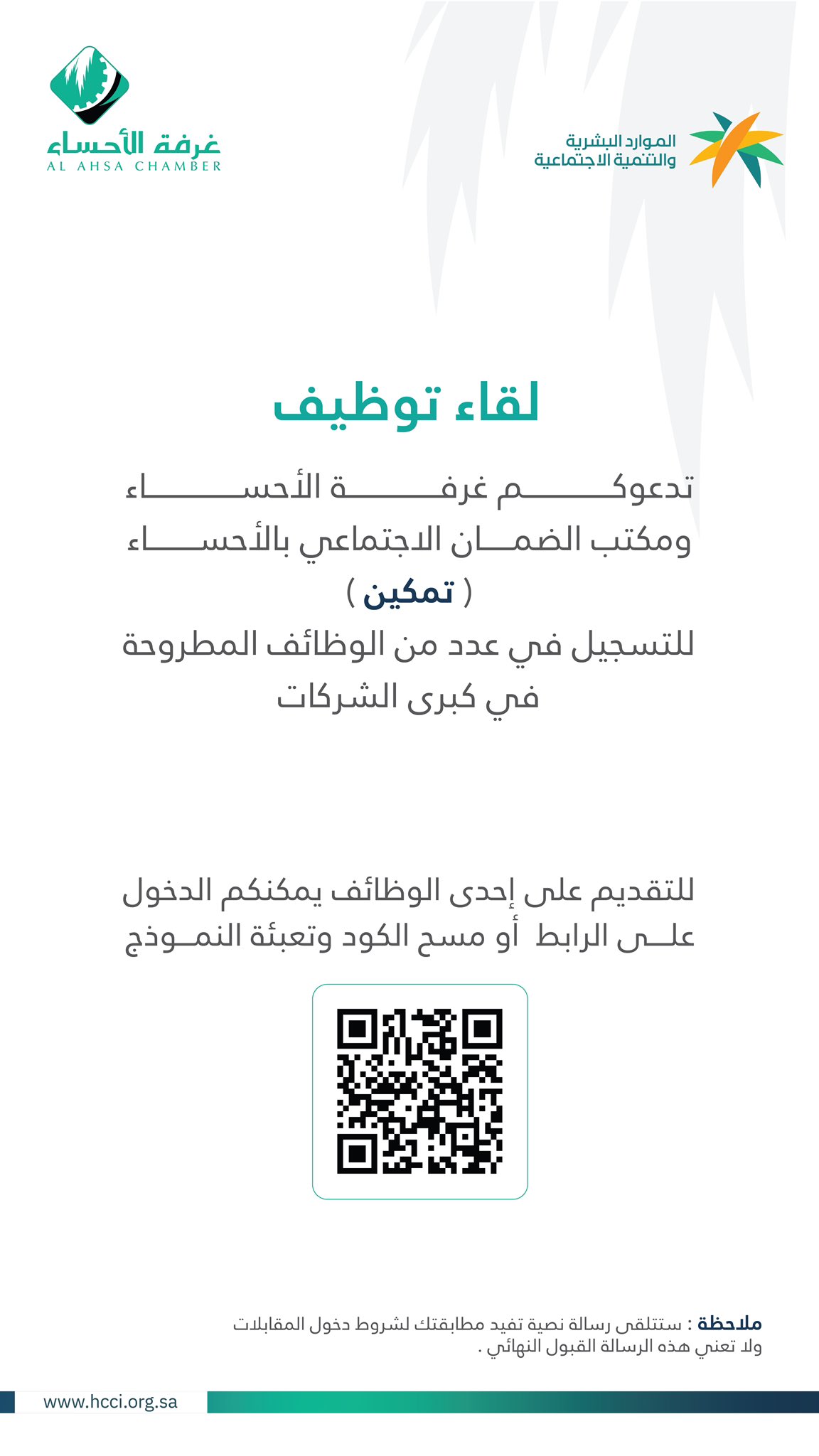 دعت غرفة الأحساء، بالتعاون مع مكتب الضمان الاجتماعي بالأحساء ( تمكين )، للتسجيل في عدد من الوظائف المطروحة في كبرى الشركات.