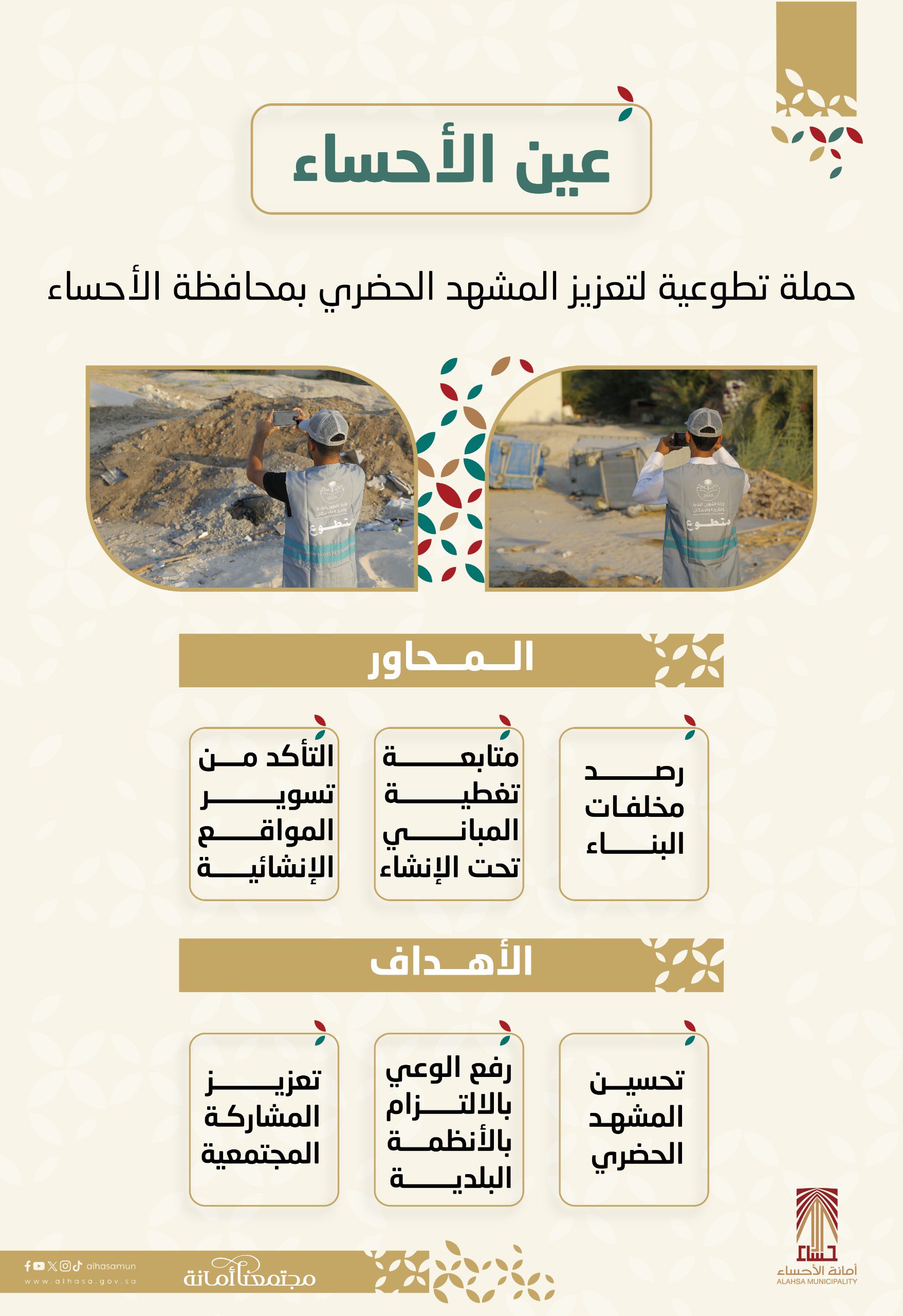 أعلنت أمانة الأحساء إطلاق مبادرة ”عين الأحساء” وهي مبادرة تطوعية لتعزيز المشهد الحضري.