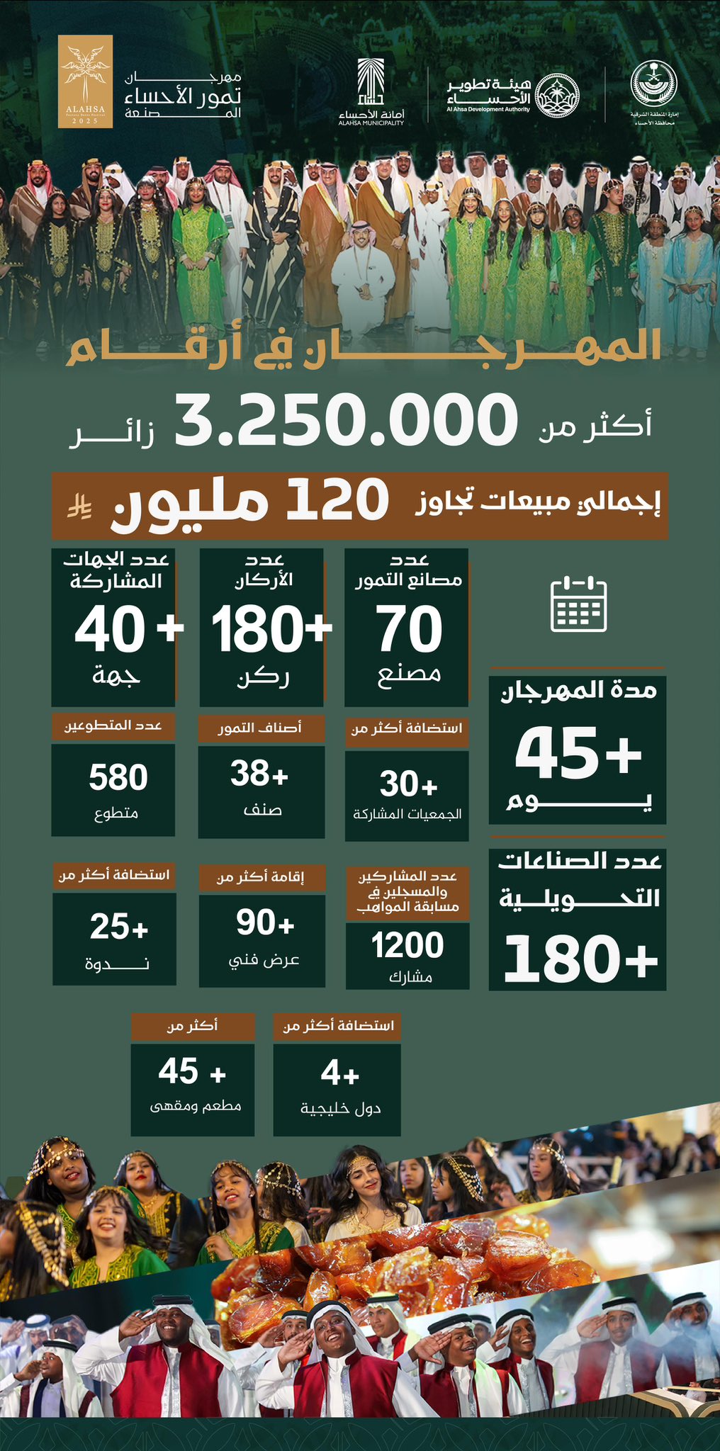 شهد مهرجان تمور الأحساء المصنّعة 2025، أرقام استثنائية في نسخته الحالية، بعد أن تجاوز 3.250.000 زائر، وحجم مبيعات بلغ 120 مليون وأكثر.