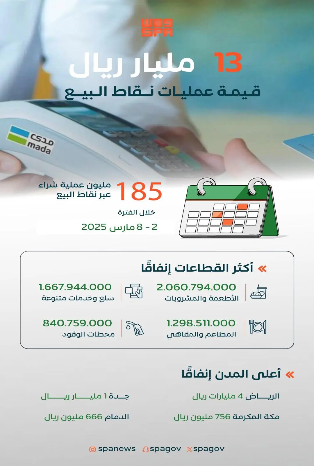 بلغ عدد عمليات نقاط البيع في المملكة خلال المدة من 02 – 08 مارس 2025م ( أول أسبوع من شهر رمضان ), 185.481.000 عملية، بقيمة 13.096.977.000 ريال، مقابل 17.575.070.000 ريال، عن المدة السابقة نفسها.