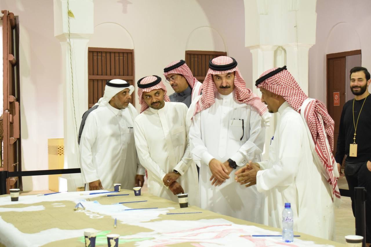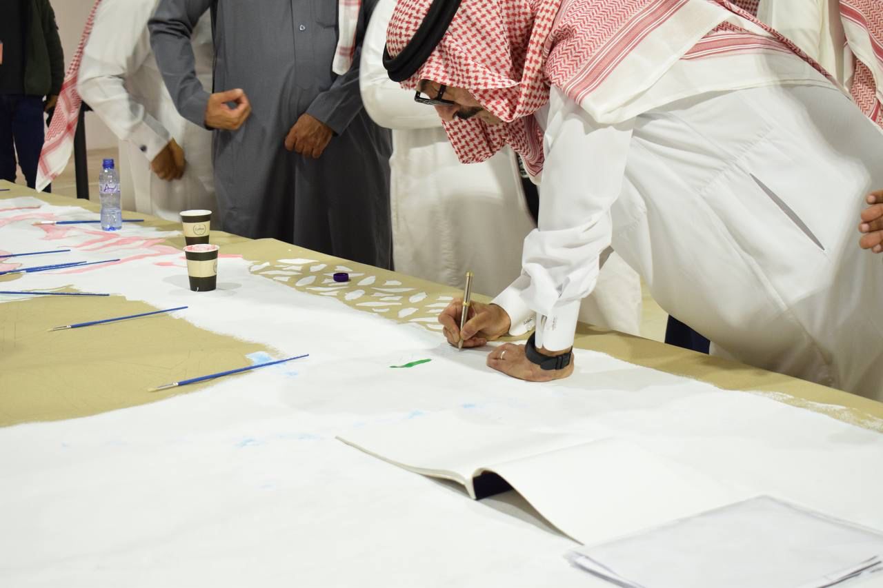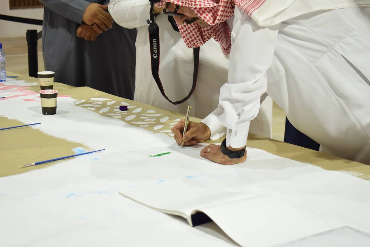 حيث بدأ سموه بإفتتاح المشاركة برسم حرف الآلف وتدوين مشاركته على اللوحة حسب القواعد في الخط العربي ,حيث يبلغ طول اللوحة 5 أمتار وبعرض 170 سنتيمتر يعرض عليها عدد من معالم الأحساء وبعض النقوش الجبسية المعروفة في المنطقة والزخارف الإسلامية وبعض التطريزات للبشت الحساوي إضافة إلى وضع بصمات بمشاركة من الصغار والكبار لحروف اللغة العربية بطرق مختلفة لترسيخ الحرف في الذهن وطريقة رسمه بشكل صحيح ويشارك في عمل هذه اللوحة المواطنين والسياح ويتم تلوينها بأسلوب تعليمي مميز .
