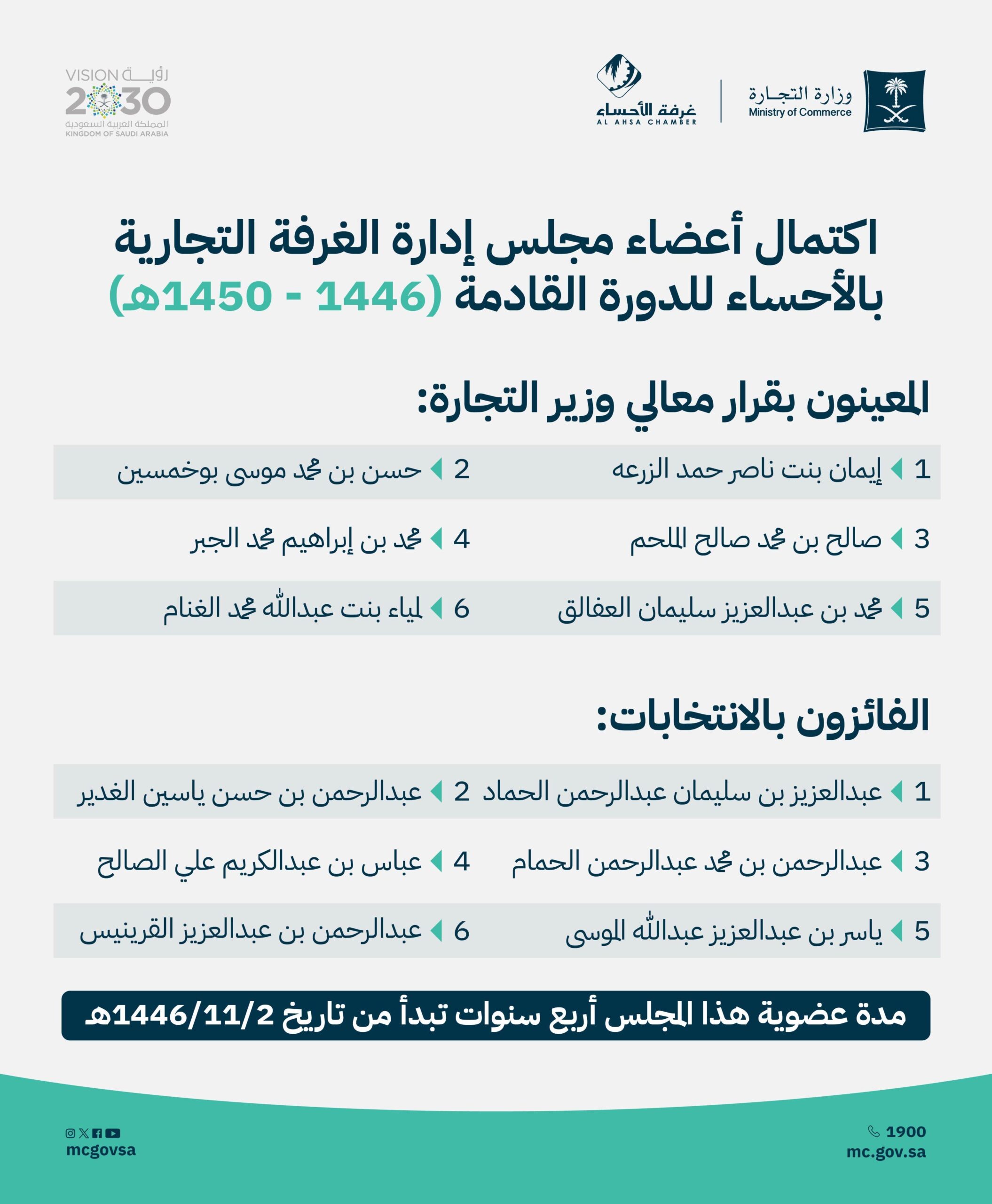 اكتمل أعضاء مجلس إدارة الغرفة التجارية بالأحساء بعد صدور قرار معالي وزير التجارة الدكتور ماجد القصبي