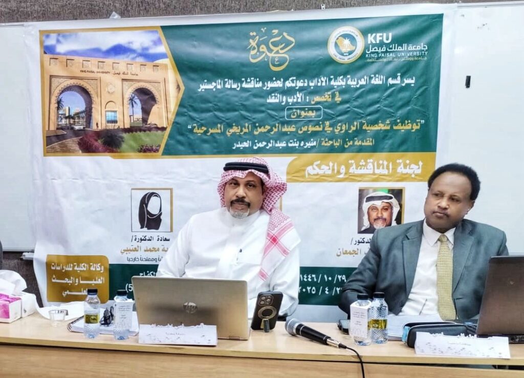 نوقشت صباح الأحد الموافق 29 شوال 1446 بكلية آداب جامعة الملك فيصل، رسالة علمية مقدمة لنيل درجة الماجستير للطالبة الباحثة منيرة عبد الرحمن الحيدر وهي بعنوان توظيف شخصية الراوي في نصوص عبد الرحمن المريخي المسرحية.