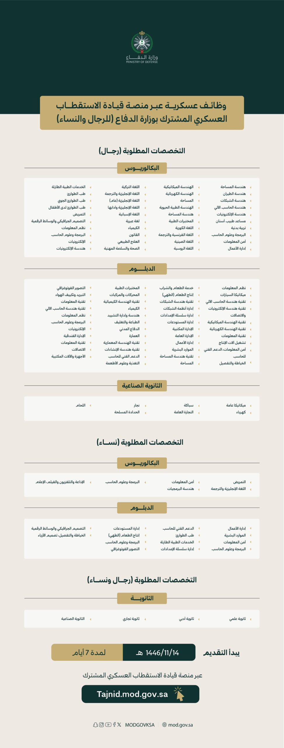أعلنت وزارة الدفاع في المملكة العربية السعودية عن فتح باب التقديم على عدد من الوظائف العسكرية للرجال والنساء، وذلك من خلال منصة قيادة الاستقطاب العسكري المشترك. تشمل الوظائف المطروحة مجموعة متنوعة من التخصصات لحملة البكالوريوس، الدبلوم، الثانوية العامة، والثانوية الصناعية.