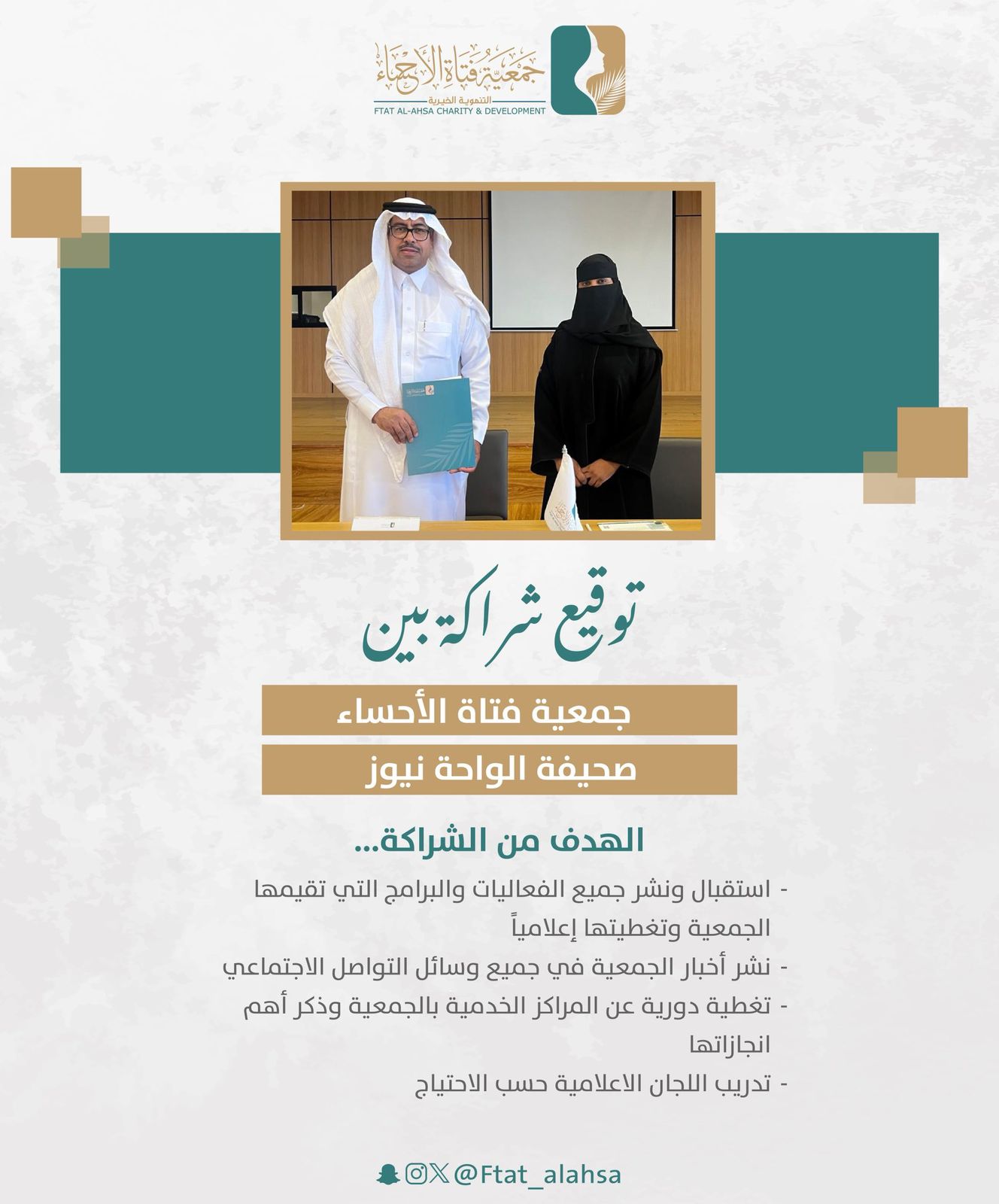 وقّعت صحيفة الواحة نيوز، اتفاقية شراكة إعلامية مع جمعية فتاة الأحساء للتنمية، وذلك بحضور كل من مدير العلاقات العامة بالصحيفة الأستاذ خالد الدوسري، والمديرة التنفيذية للجمعية الأستاذة عائشة الدوسري.