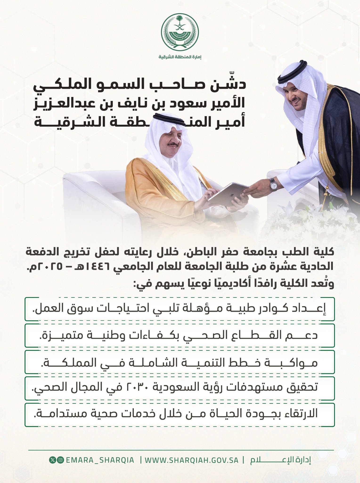 بكل فخر، دشّن صاحب السمو الملكي الأمير سعود بن نايف بن عبدالعزيز، أمير المنطقة الشرقية، كلية الطب بجامعة حفر الباطن، وذلك خلال رعايته حفل تخرج الدفعة الحادية عشرة من طلبة الجامعة للعام الجامعي 1446هـ – 2025م.