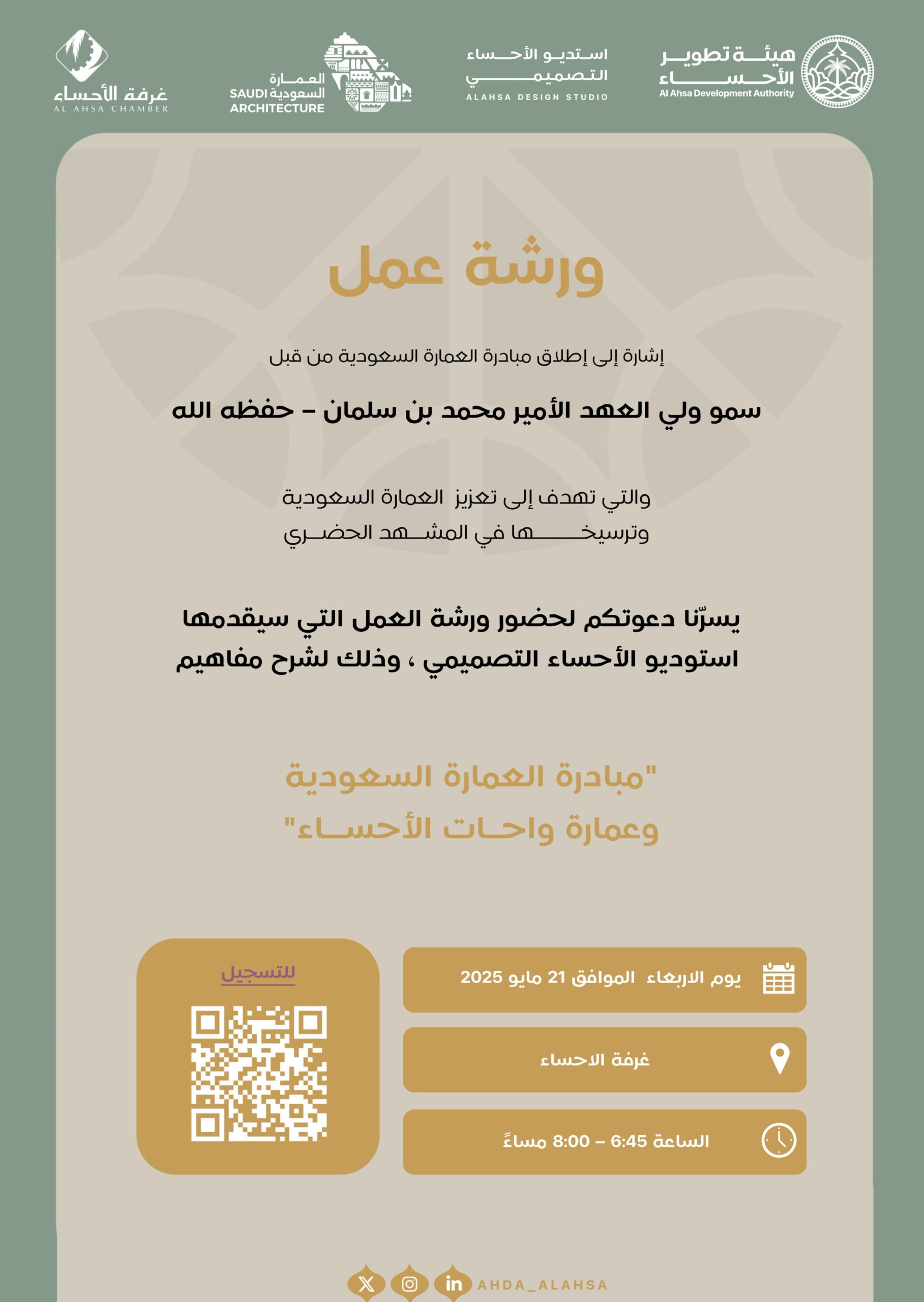 تُقام الورشة يوم الأربعاء الموافق 21 مايو 2025، من الساعة 6:45 حتى 8:00 مساءً، ويقدمها “استوديو الأحساء التصميمي” بهدف شرح مفاهيم “مبادرة العمارة السعودية” وربطها بالسياق المحلي عبر عنوان الورشة: “مبادرة العمارة السعودية وعمارة واحات الأحساء”.