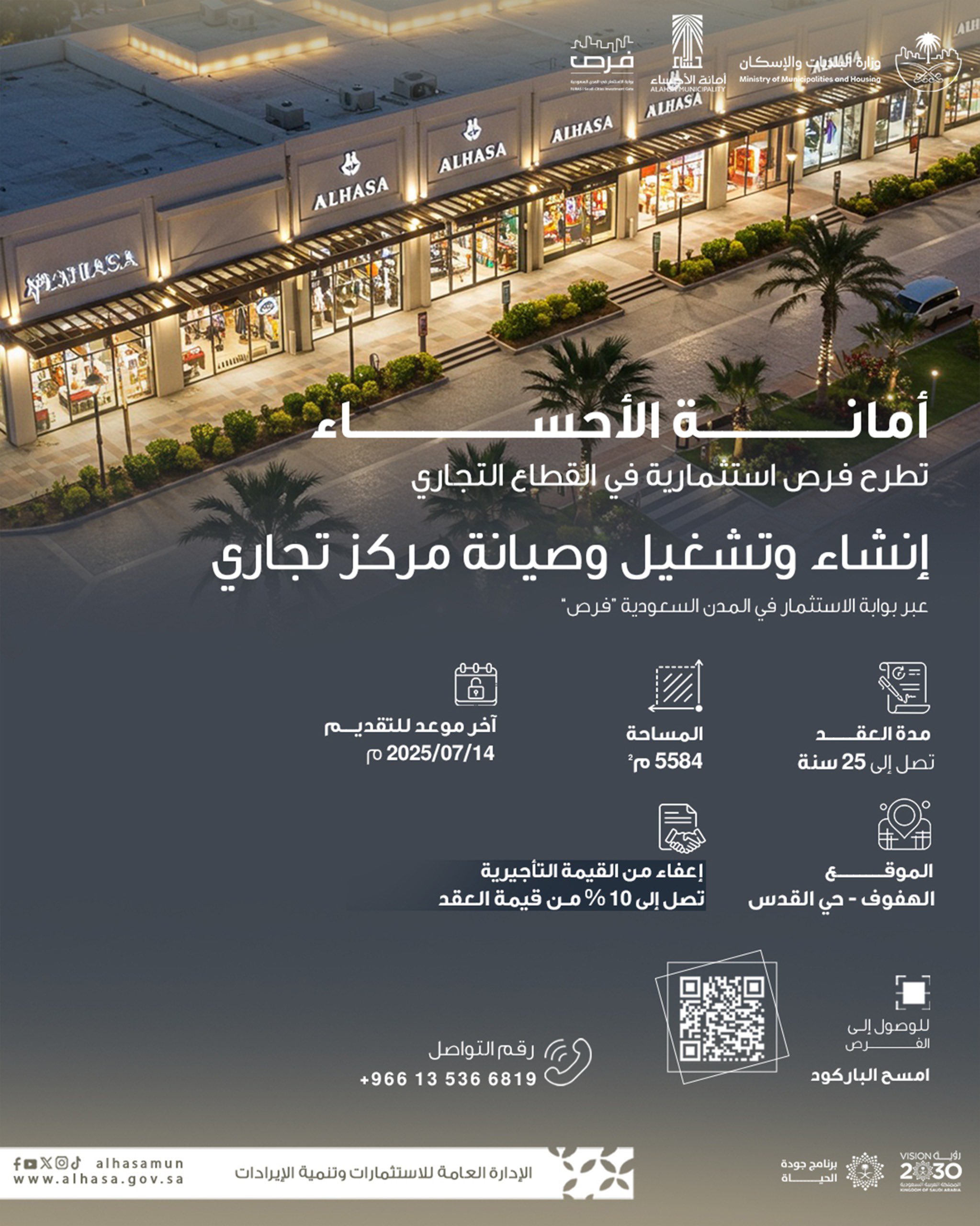 أعلنت أمانة محافظة الأحساء عن طرح فرصة استثمارية جديدة ضمن القطاع التجاري، وذلك لإنشاء وتشغيل وصيانة مركز تجاري في موقع مميز بمنطقة الموفق – حي القدس، وذلك عبر بوابة الاستثمار في المدن السعودية “فرص”.