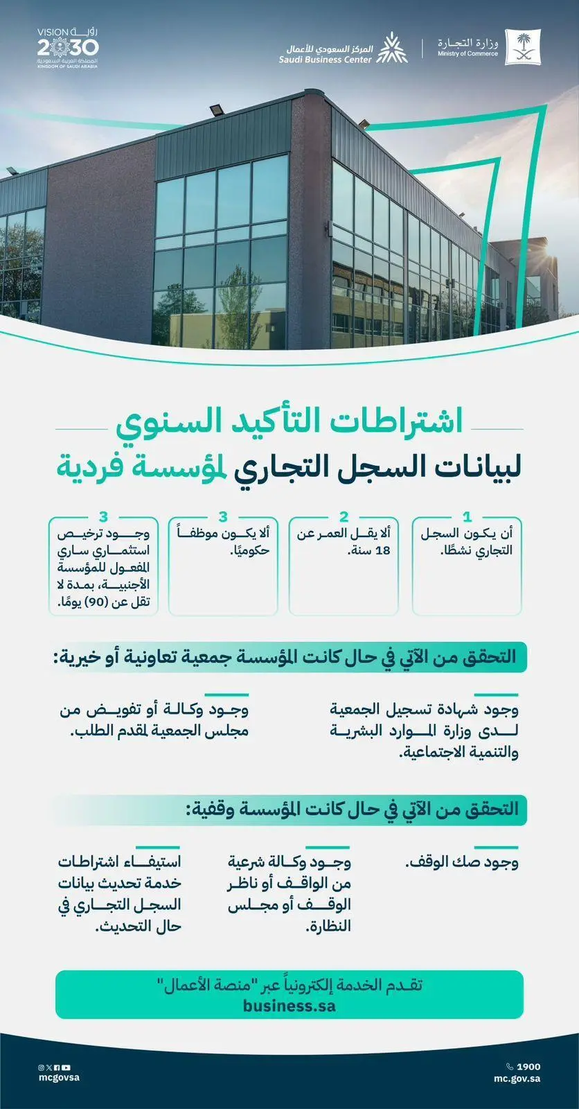 كما أوضحت وزارة التجارة، اشتراطات التأكيد السنوي لبيانات السجل التجاري للمؤسسات الفردية، وهي أن يكون السجل التجاري نشطًا، وألا يقل العمر عن (18) سنة، وألا يكون موظفًا حكوميًا، ووجود ترخيص استثماري ساري المفعول للمؤسسة الأجنبية، بمدة لا تقل عن (90) يومًا.