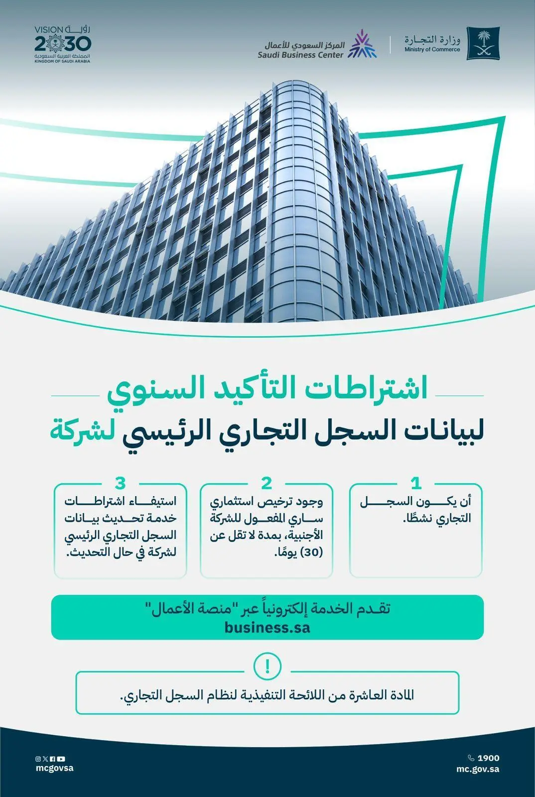 أوضحت وزارة التجارة، اشتراطات التأكيد السنوي لبيانات السجل التجاري للشركات، وهي أن يكون السجل التجاري نشطًا، ووجود ترخيص استثماري ساري المفعول للشركة الأجنبية بمدة لاتقل عن (30) يومًا، وأن يتم استيفاء اشتراطات خدمة تحديث بيانات السجل التجاري الرئيسي لشركة في حال التحديث.