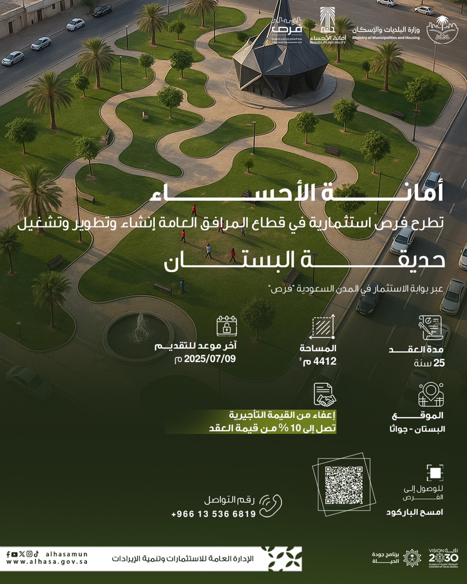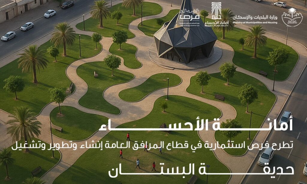 أعلنت أمانة محافظة الأحساء عن طرح فرصة استثمارية مميزة في قطاع المرافق العامة، تهدف إلى إنشاء وتطوير وتشغيل حديقة البستان، وذلك ضمن جهودها المستمرة لتعزيز جودة الحياة وتحقيق مستهدفات رؤية المملكة 2030.