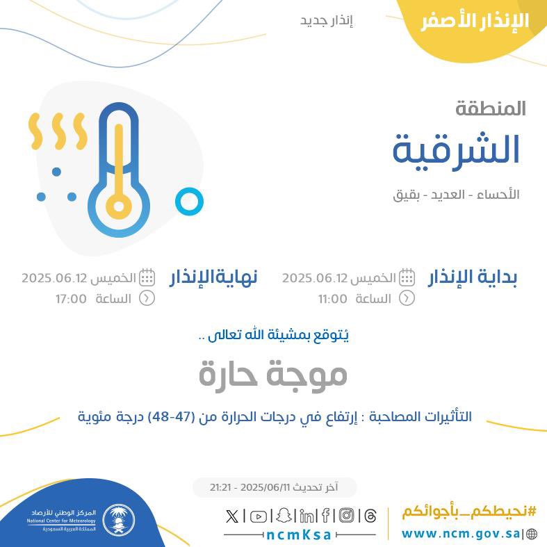 أطلق المركز الوطني للأرصاد، منذ قليل، الإنذار الأصفر بموجة حارة، على الأحساء والعديد وبقيق، حيث تترواح درجات الحرارة ما بين 47 و 48 درجة مئوية.