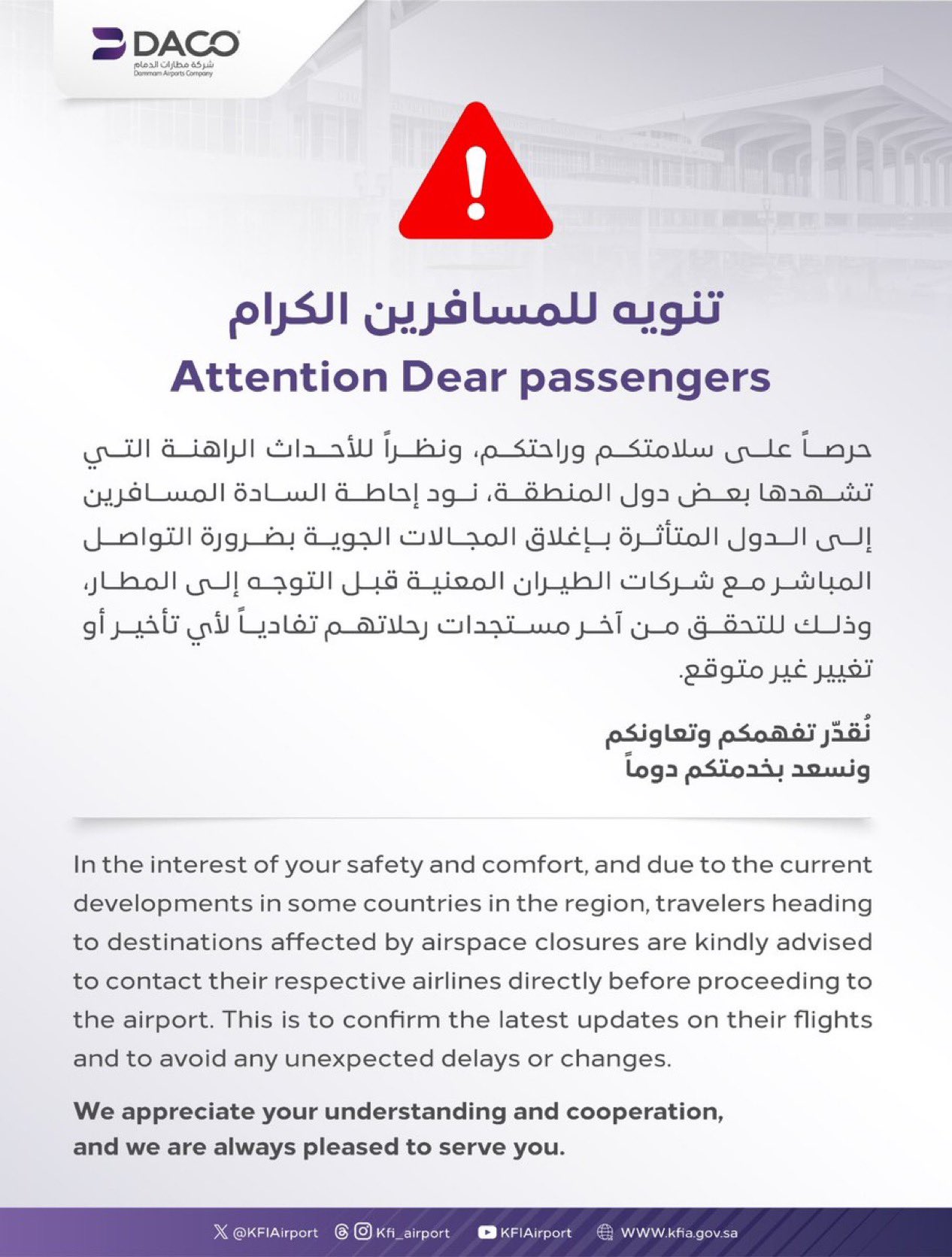 حرصًا على سلامتكم وراحتكم، ونظرًا للتطورات الراهنة في بعض دول المنطقة، تود شركة مطارات الدمام (DACO) إحاطة المسافرين المتوجهين إلى وجهات متأثرة بإغلاق المجالات الجوية بضرورة التواصل المباشر مع شركات الطيران المعنية قبل التوجه إلى المطار.
