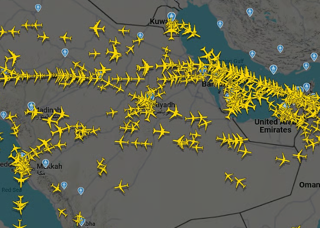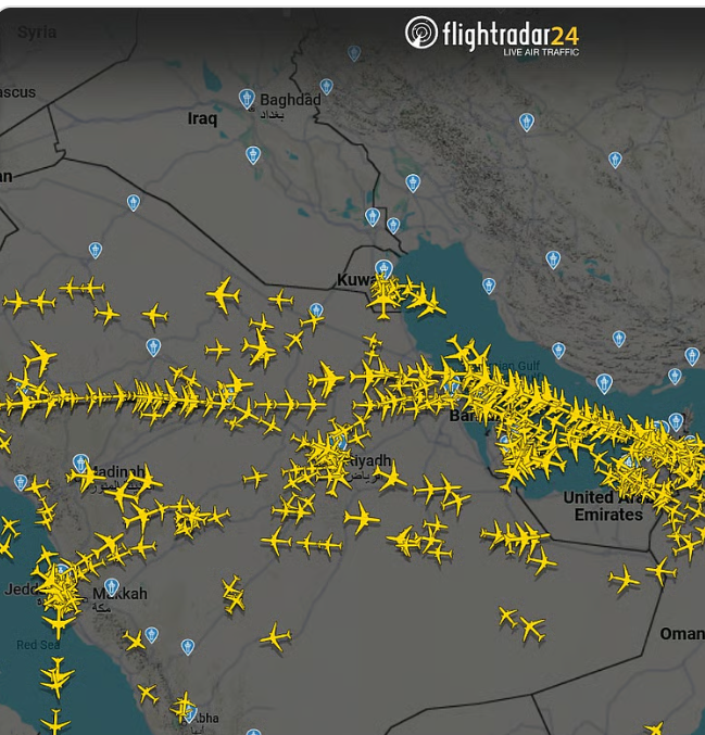 واستبدلت خطوط الطيران المجالات الجوية المغلقة بالمجال الجوي السعودي والخليجي، حيث يظهر كأحد أكثر الممرات والمسارات الجوية أمانًا وازدحامًا في المنطقة.