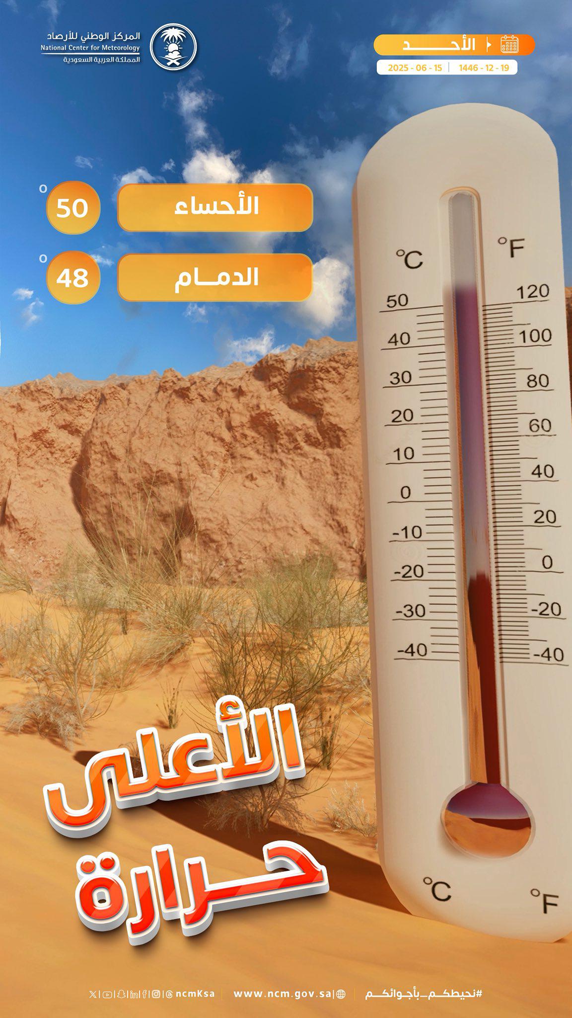 سجلت محافظة الأحساء، اليوم الأحد، أعلى درجة حرارة في المملكة العربية السعودية، حيث بلغت 50 درجة مئوية، بحسب ما أعلنه المركز الوطني للأرصاد. وجاءت مدينة الدمام في المرتبة الثانية بدرجة حرارة بلغت 48 درجة مئوية.
