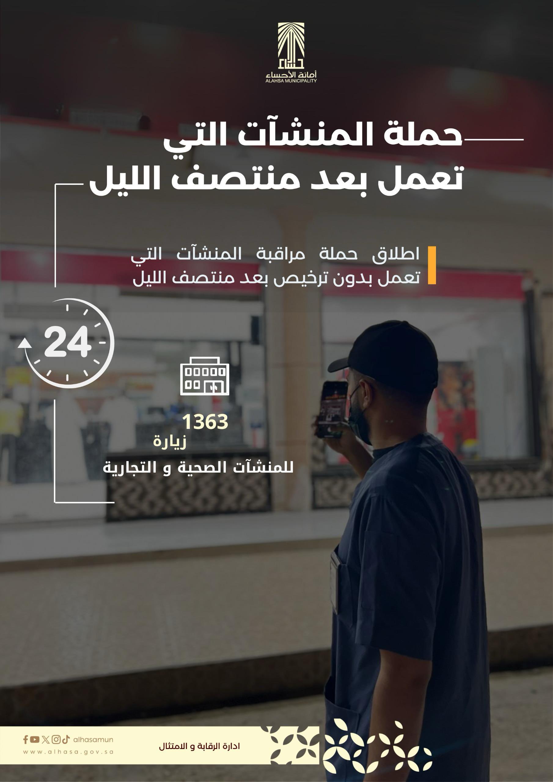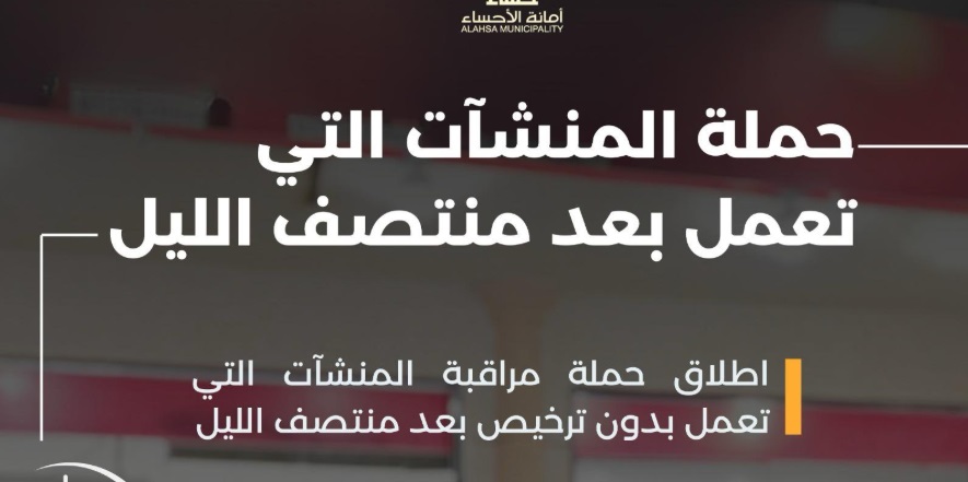 أطلقت أمانة الأحساء ممثلة في إدارة الرقابة والامتثال، حملة ميدانية مكثفة لمراقبة المنشآت الصحية والتجارية التي تعمل بعد منتصف الليل دون تراخيص نظامية.