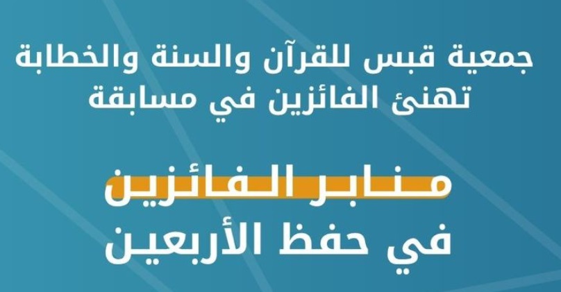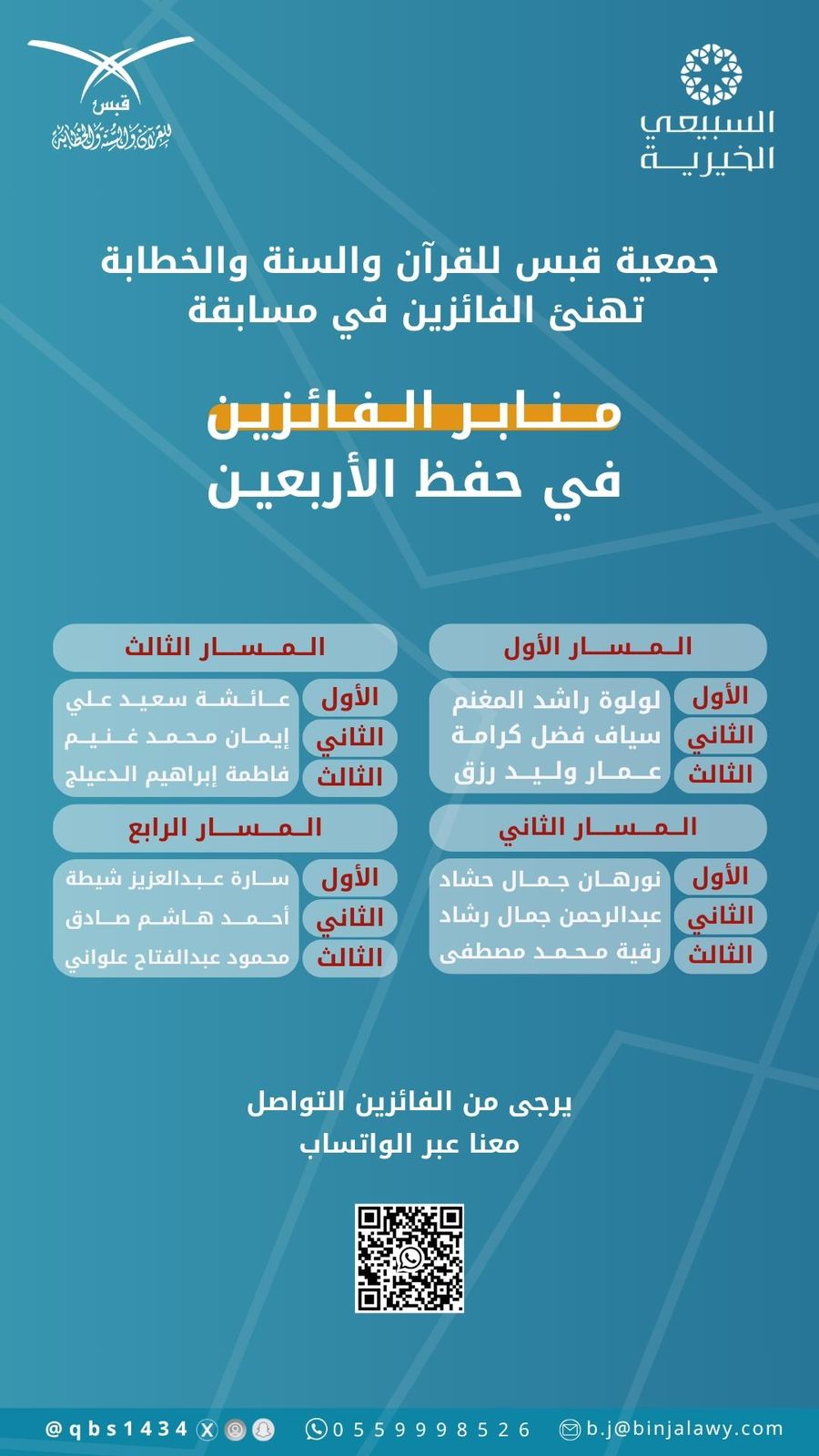 بدعم من مؤسسة عبدالله السبيعي الخيرية، اختتمت جمعية قبس للقرآن والسنة والخطابة النسخة الثانية من مسابقة منازل الفائزين في حفظ الأربعين النووية، والتي نُظّمت عن بُعد واستمرت لأسبوع، وسط تفاعل واسع من مختلف مناطق المملكة وخارجها، حيث بلغ عدد المشاركين أكثر من 500 متسابق ومتسابقة.