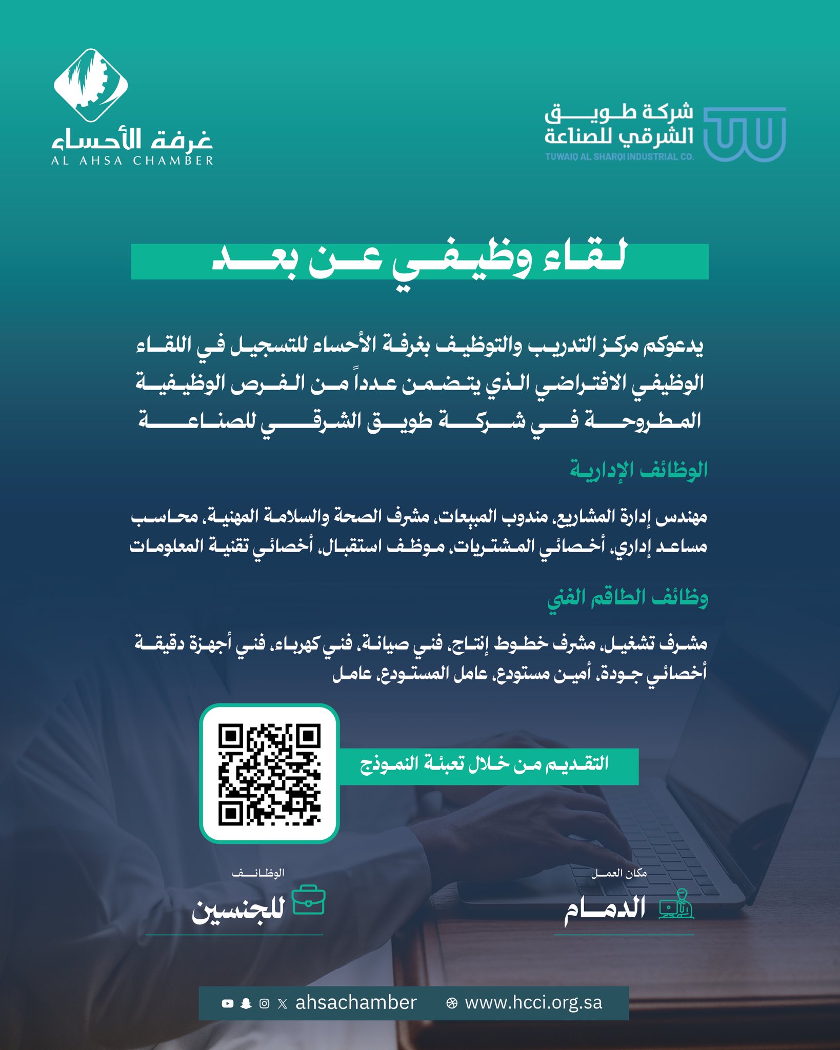 يدعوكم مركز التدريب والتوظيف بغرفة الأحساء للتسجيل في اللقاء الوظيفي الافتراضي الذي يتضمن عددًا من الفرص الوظيفية المطروحة في شركة طويق الشرقي للصناعة