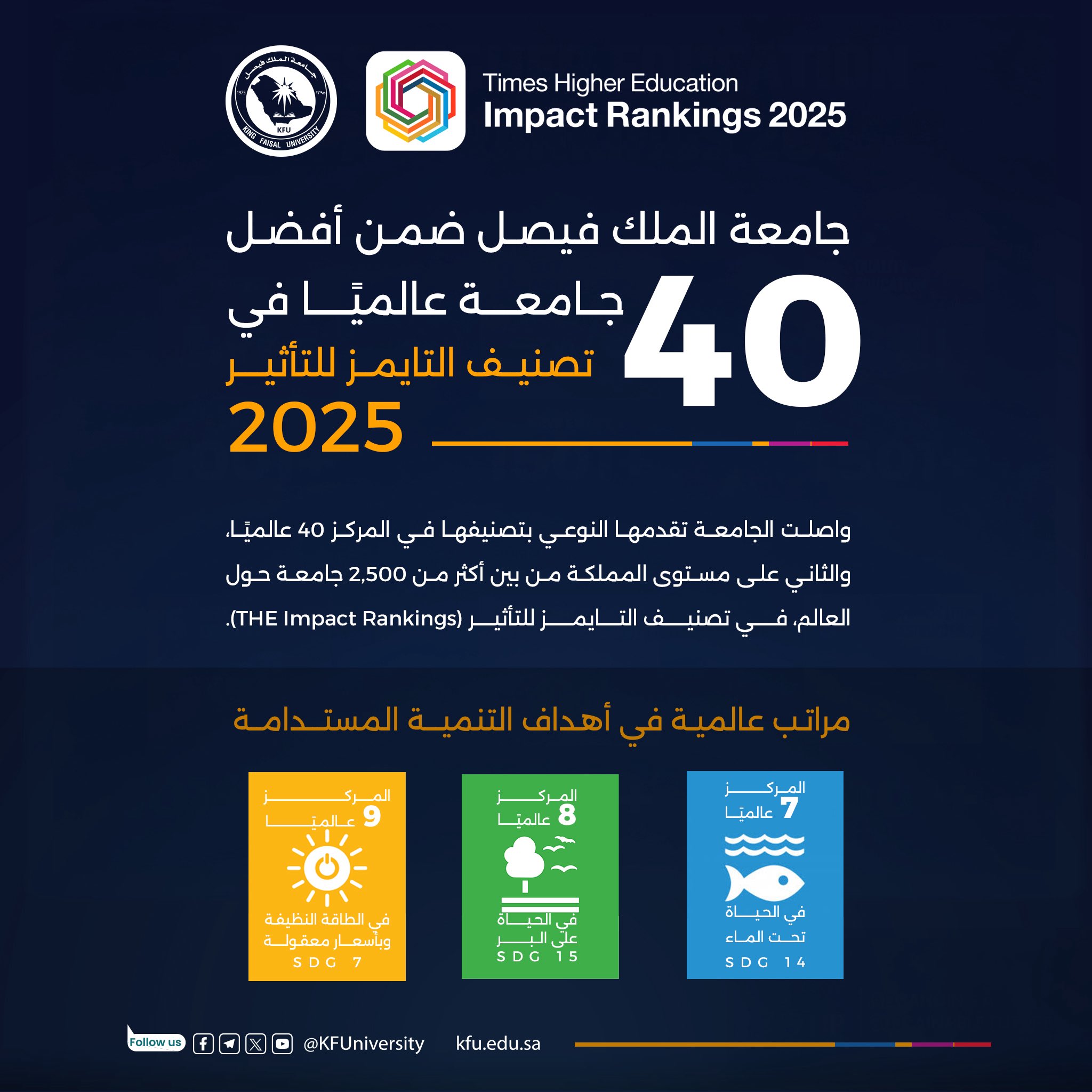 حققت جامعة الملك فيصل إنجازًا عالميًا بارزًا بتصنيفها ضمن أفضل 40 جامعة على مستوى العالم في تصنيف التايمز للتأثير لعام 2025 (THE Impact Rankings)، والذي يقيس مدى التزام الجامعات بتحقيق أهداف التنمية المستدامة التي وضعتها الأمم المتحدة.