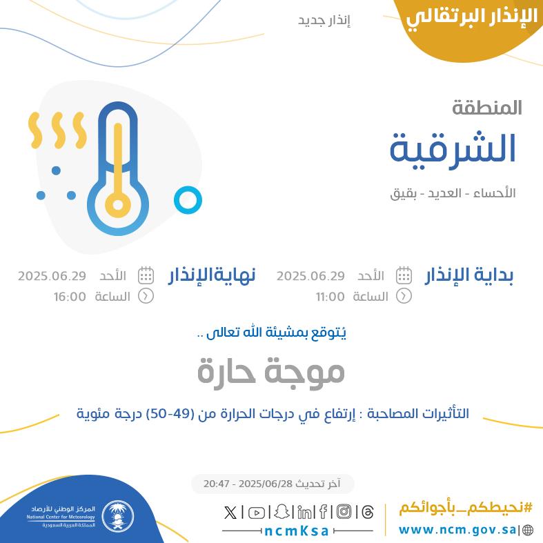 وشمل الإنذار؛محافظة الأحساء والعديد وبقيق، حيث نبه الأرصاد من موجة حارة مصحوبة بارتفاع في درجات الحرارة من (47-50) درجة مئوية، من الساعة: 11:00 صباح الأحد حتى 04:00 مساء اليوم نفسه.