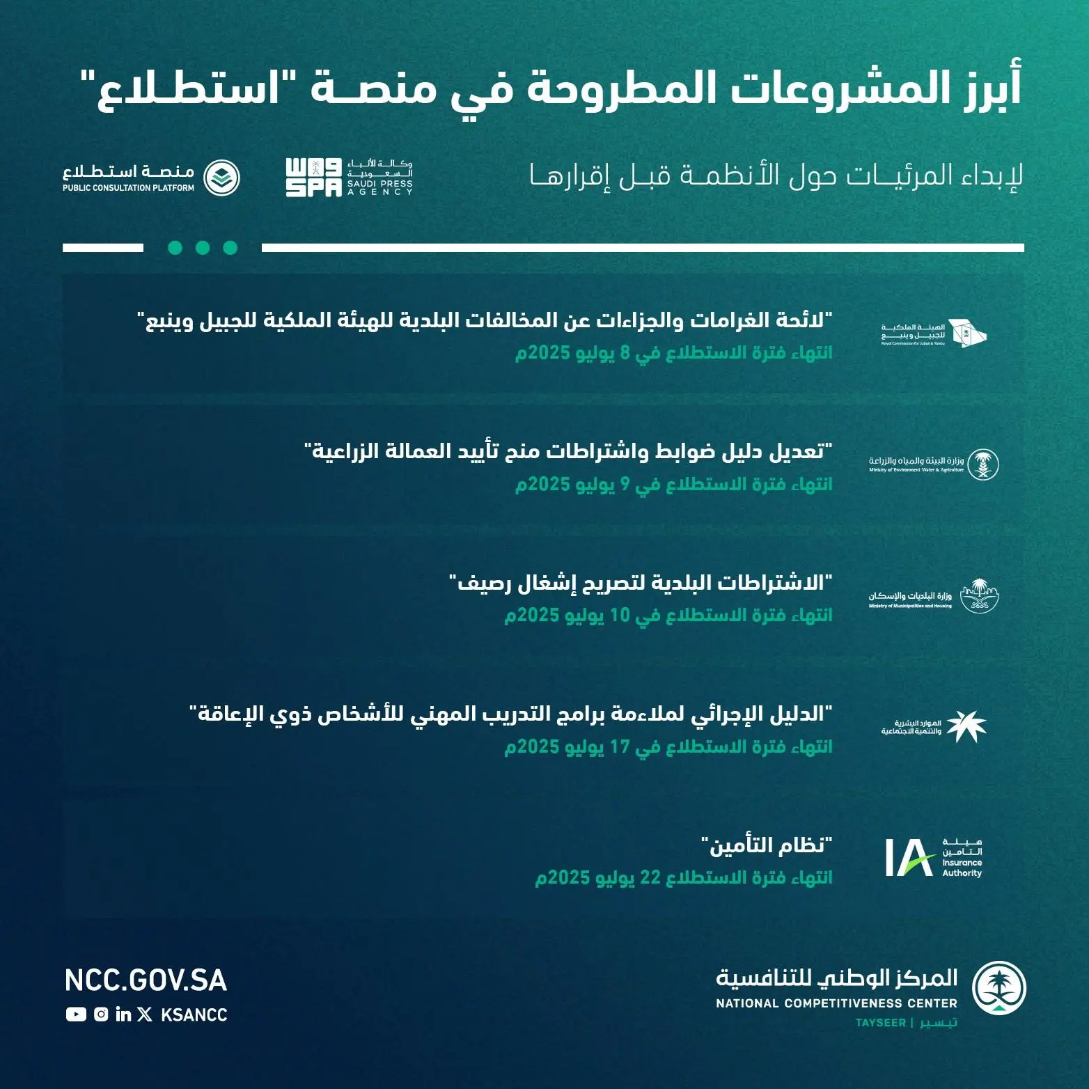طرحت المنصة الإلكترونية الموحدة لاستطلاع آراء العموم والجهات الحكومية والإشراف عليها (منصة استطلاع) التابعة للمركز الوطني للتنافسية، 21 مشروعًا ذا صلة بالشأن الاقتصادي والتنموي، بالتعاون مع 14 جهة حكومية؛ لتمكين أصحاب المصلحة، من إبداء المرئيات والمقترحات حولها قبل إقرارها.