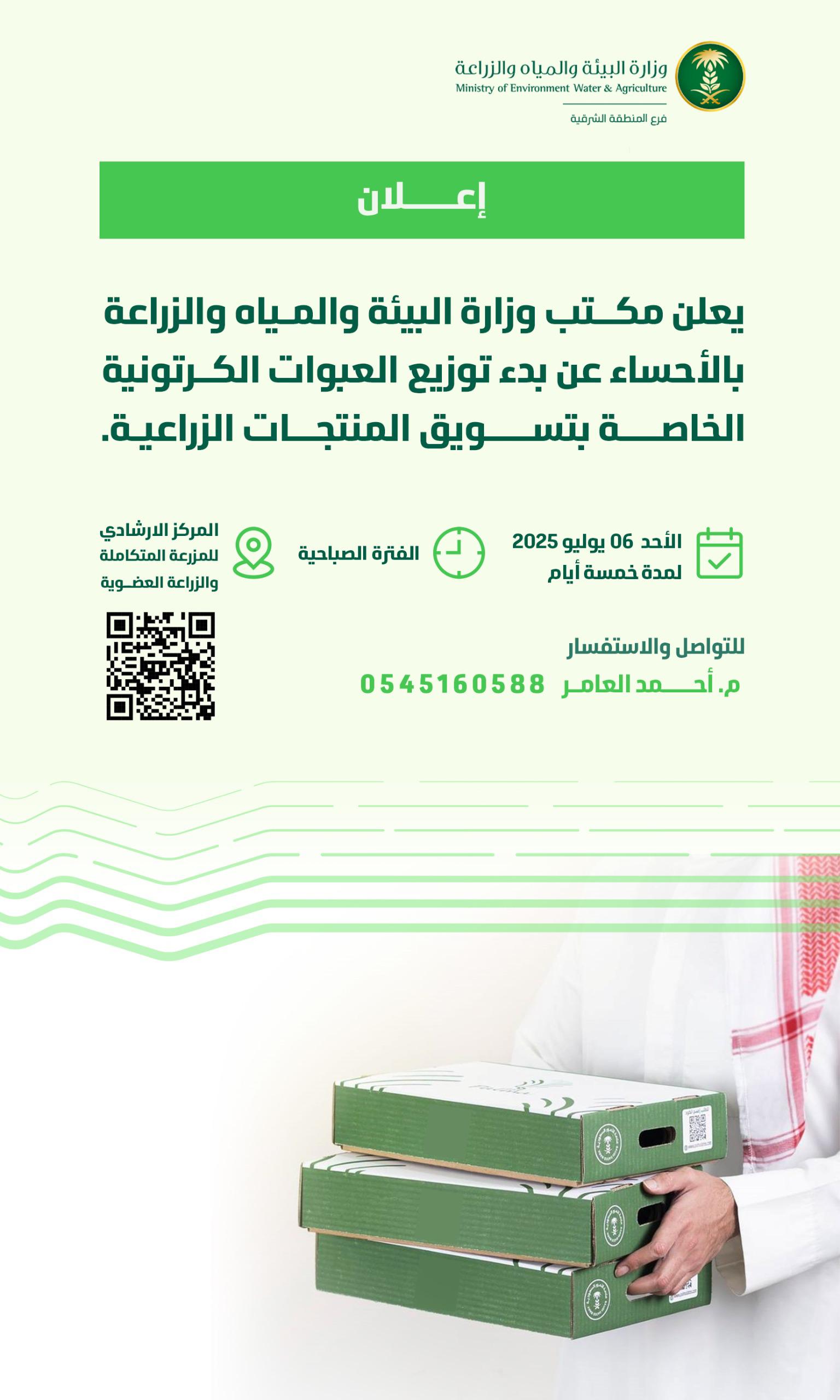 يُعلن مكتب وزارة البيئة والمياه والزراعة عن بدء توزيع العبوات الكرتونية المخصصة لتسويق المنتجات الزراعية، وذلك ضمن مبادراتها الداعمة للقطاع الزراعي المحلي وتعزيز جودة التسويق الزراعي.