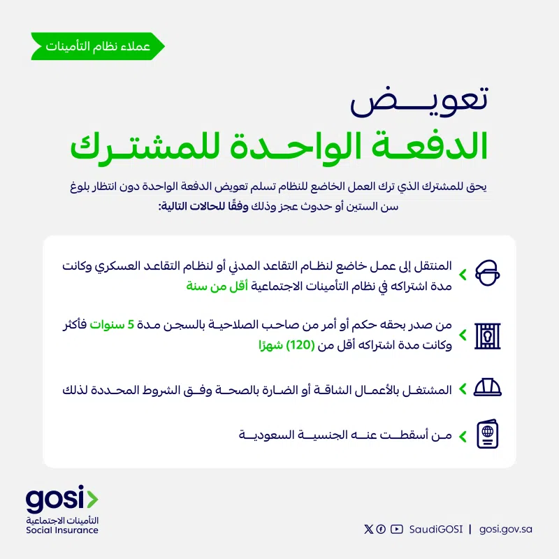 التأمينات توضح حالات صرف تعويض الدفعة الواحدة قبل بلوغ سن الستين