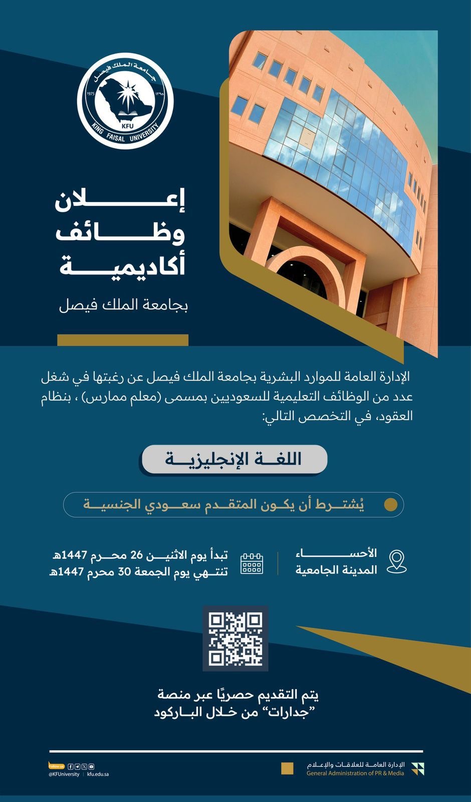واشترطت الجامعة أن يكون المتقدم سعودي الجنسية، موضحة أن التقديم سيكون متاحًا حصريًا عبر منصة “جدارات” من خلال الباركود المرفق في الإعلان.
