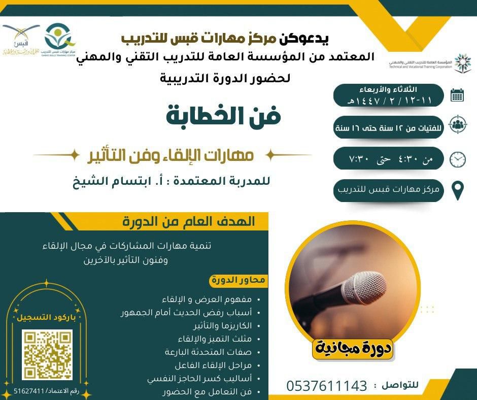 أطلق مركز مهارات قبس للتدريب – أحد مبادرات جمعية قبس للقرآن والسنة والخطابة والمعتمد من المؤسسة العامة للتدريب التقني والمهني – دعوته للفتيات للمشاركة في دورة تدريبية مجانية بعنوان “فن الخطابة: مهارات الإلقاء وفن التأثير”، والتي من المقرر إقامتها يومي الثلاثاء والأربعاء الموافق 11-12 من شهر ربيع الأول 1447هـ، بمقر المركز في مدينة الهفوف بالأحساء.