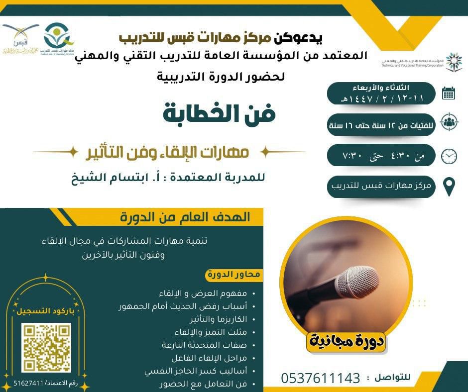 يُذكر أن الدورة المجانية تأتي تزامنًا مع #يوم_المتحدثين_المحترفين، بهدف صناعة جيل متمكن في مهارات التعبير والتأثير، بما يُعزز من مشاركته المجتمعية وتفاعله الإيجابي.