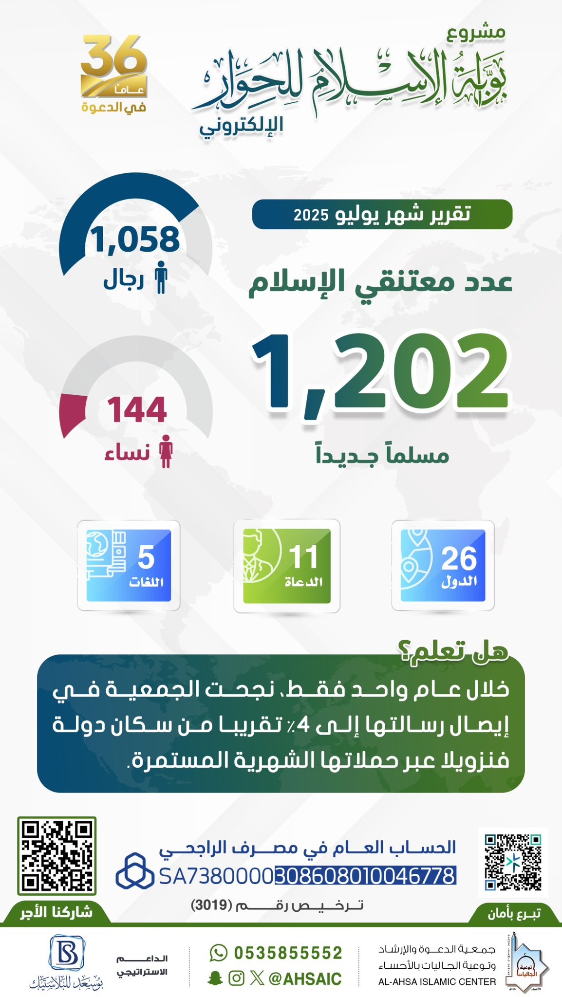أعلنت جمعية الدعوة والإرشاد وتوعية الجاليات بالأحساء، عبر مشروع “بوابة الإسلام للحوار الإلكتروني”، عن اعتناق 1,202 شخص للإسلام خلال شهر يوليو 2025، منهم 1,058 رجلاً و144 امرأة، من 26 دولة وبـ5 لغات، على يد 11 داعية.