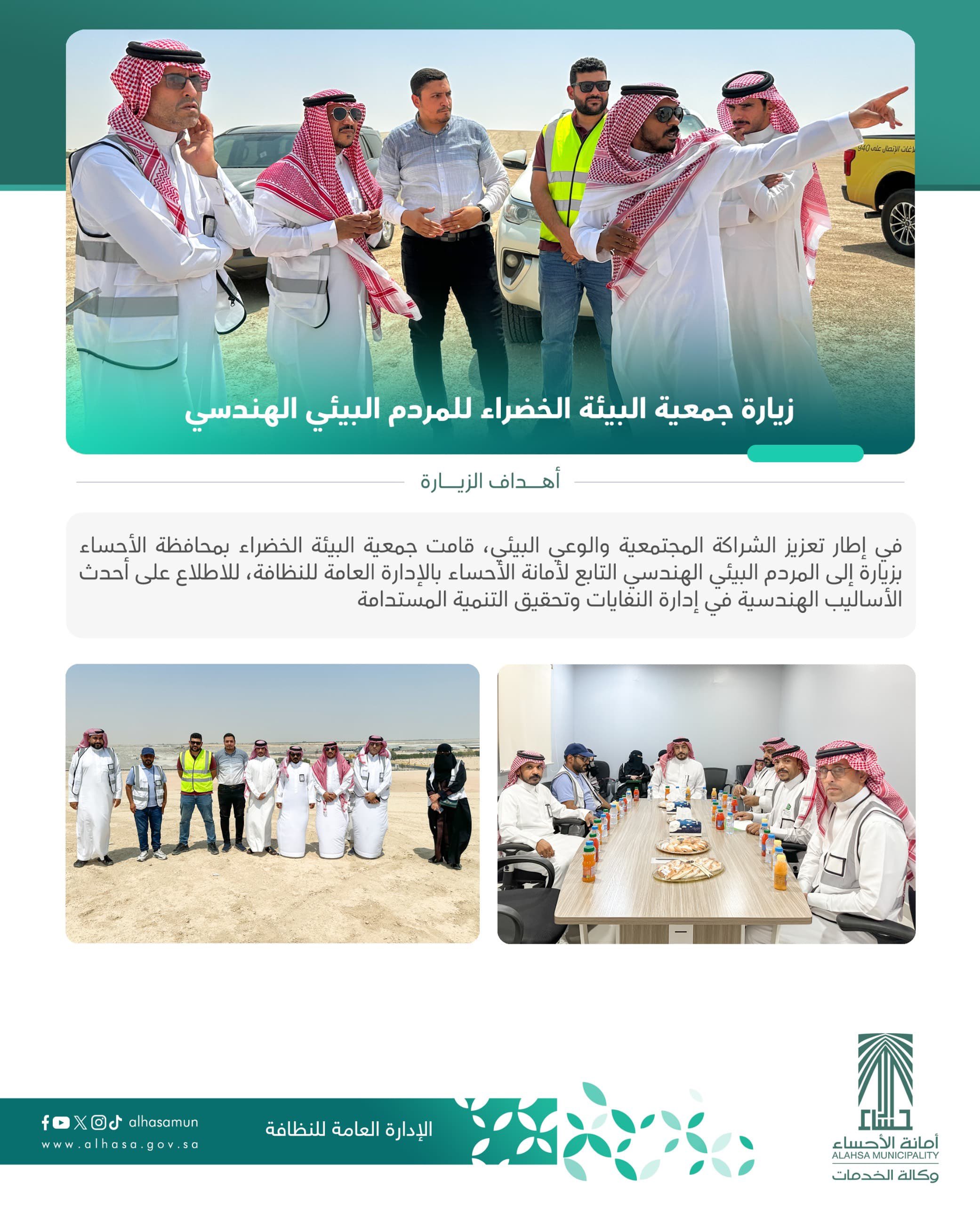 في إطار تعزيز الشراكة المجتمعية ونشر الوعي البيئي، نظمت جمعية البيئة الخضراء بمحافظة الأحساء زيارة ميدانية إلى المردم البيئي الهندسي التابع لأمانة الأحساء – الإدارة العامة للنظافة.