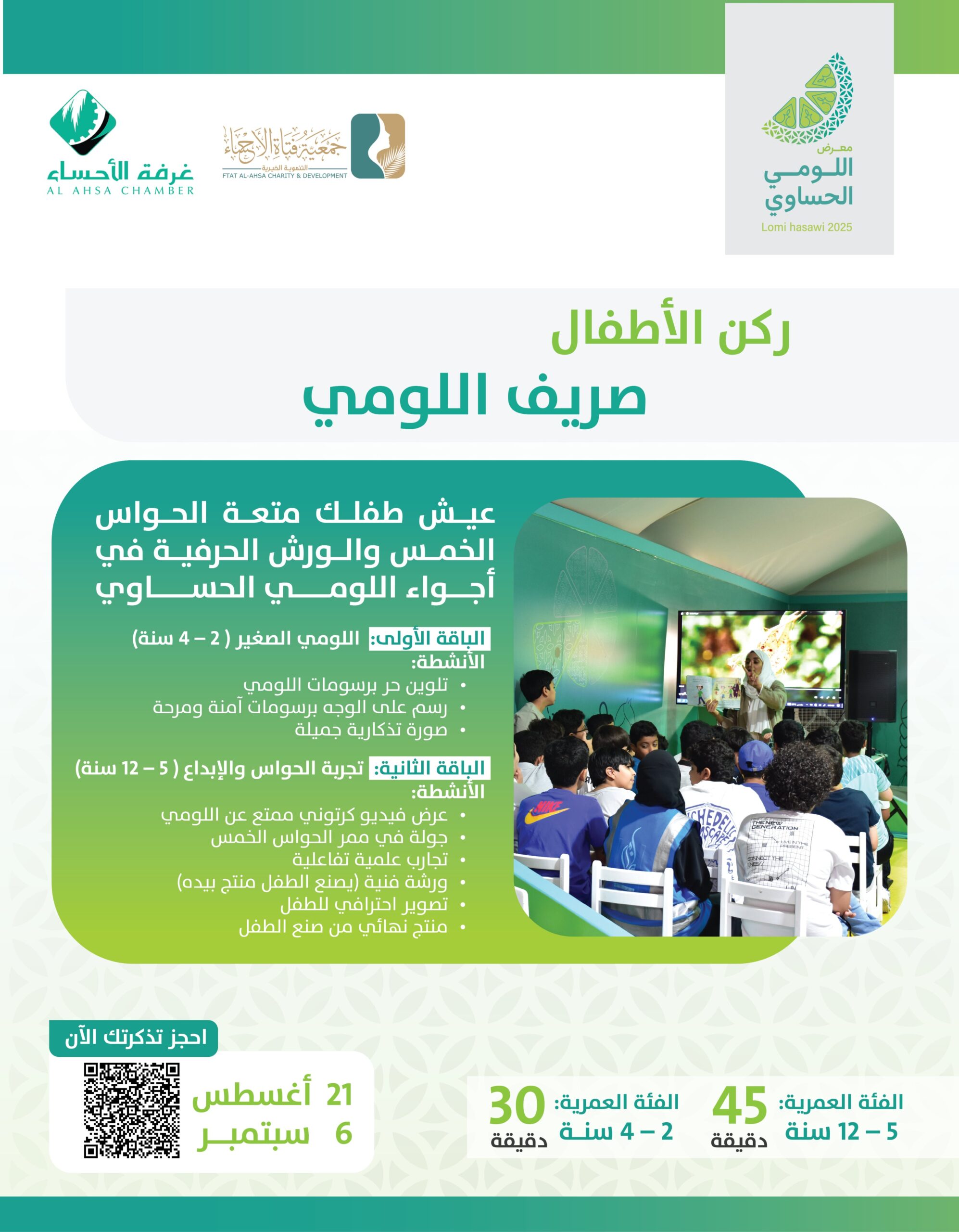 ضمن فعاليات مهرجان اللومي الحساوي 2025، تطلق غرفة الأحساء بالتعاون مع جمعية فتاة الأحساء للتنمية الخيرية، ركن الأطفال “صريف اللومي” الذي يقدم باقة من الأنشطة الترفيهية والإبداعية المخصصة للفئتين العمريتين (2 – 4 سنوات) و (5 – 12 سنة).