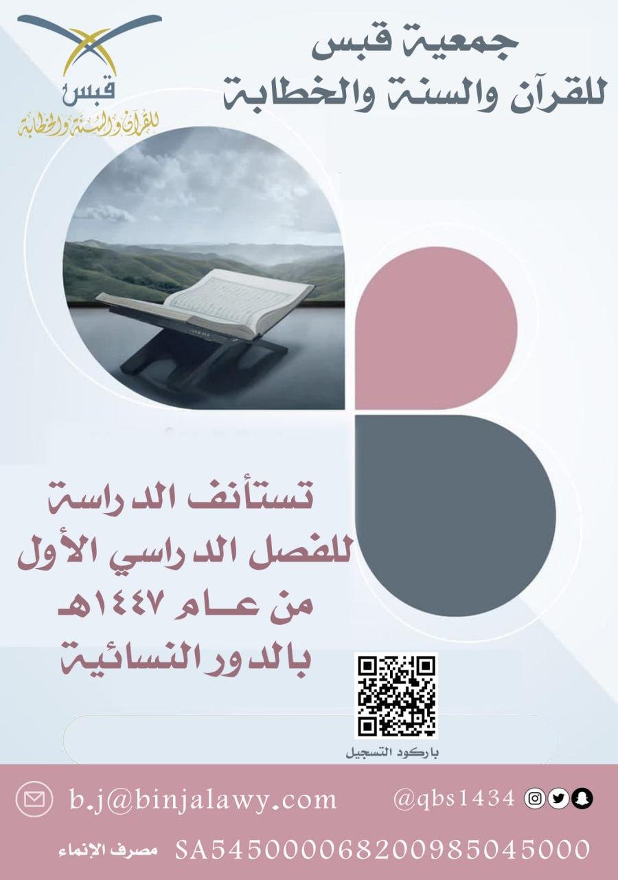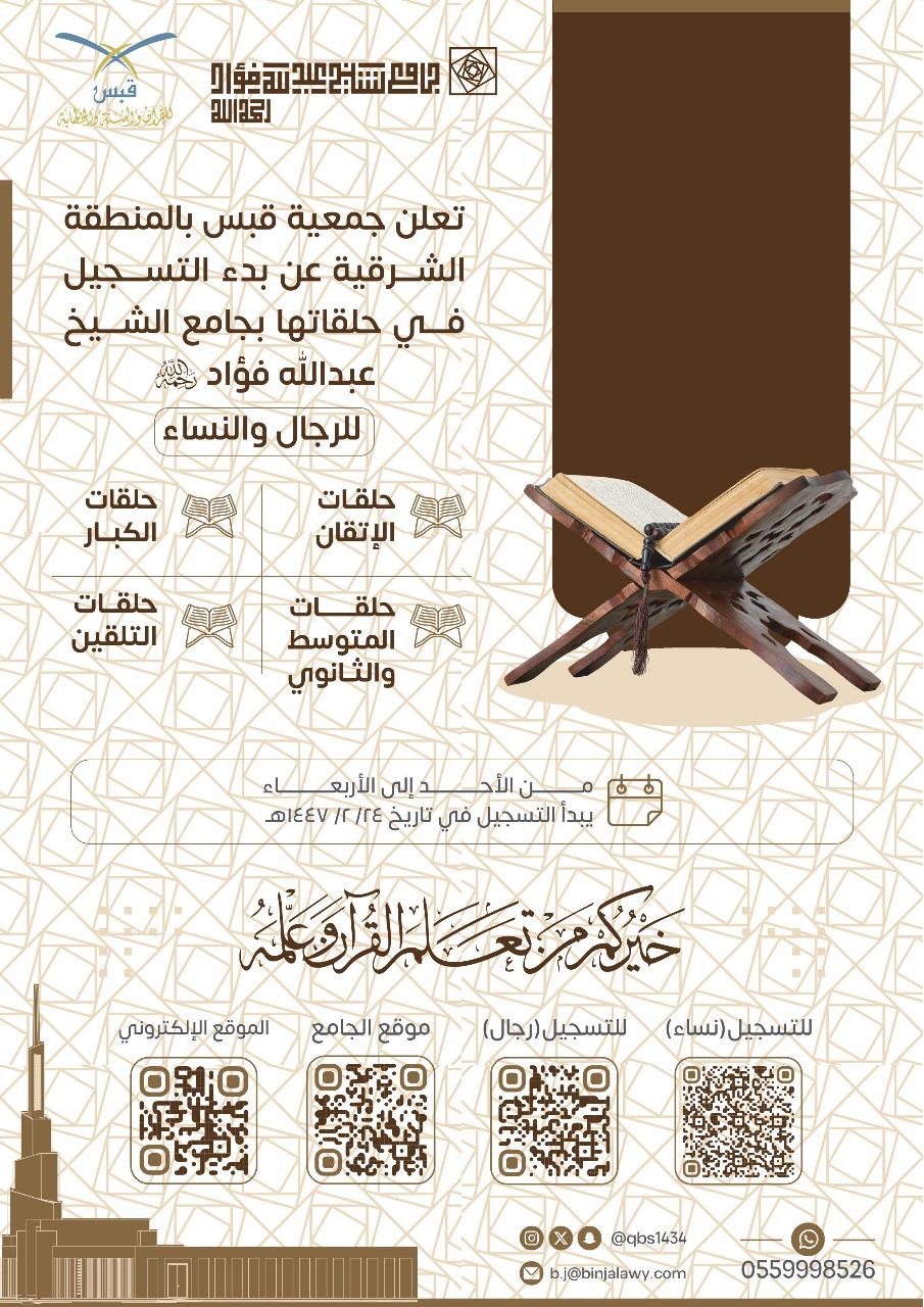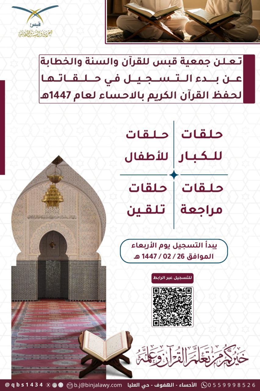 أعلنت جمعية قبس للقرآن والسنة والخطابة عن بدء استقبال الراغبين في التسجيل بحلقاتها القرآنية في الأحساء للعام الدراسي الجديد 1447/1448هـ، استمرارًا في نشر رسالتها في تعليم كتاب الله وسنة نبيه صلى الله عليه وسلم ونشرها في المجتمع.