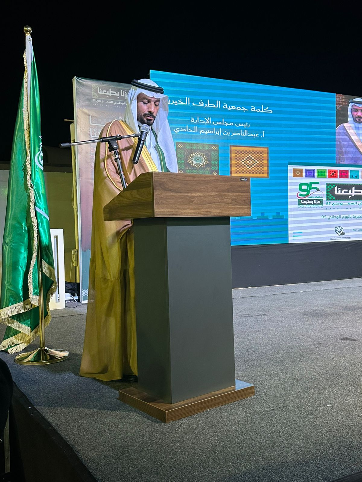 وبدأ الاحتفال بالسلام الملكي ثم كلمة لرئيس الجمعية الأستاذ عبدالناصر الحادي رحب فيها بالحضور وهنأ القيادة الرشيدة وشكر المشاركين والشركاء والمتطوعين والمتطوعات والمنظمين والحضور ثم كلمة أهالي الطرف قدمها عمدة بلدة الطرف الأستاذ احمد البوعبيد الذي قدم تهنئته لمقام خادم الحرمين الشريفين الملك سلمان بن عبدالعزيز ال سعود و ولي عهده الأمين صاحب السمو الملكي الأمير محمد بن سلمان بن عبدالعزيز ال سعود حفظهما الله بمناسبة اليوم الوطني ٩٥ للمملكة العربية السعودية سائلاً الله أن يديم الأمن و الأمان و الرخاء على بلادنا الغالية .