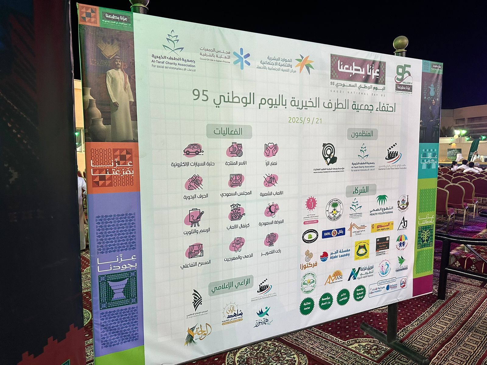 افتتحت جمعية الطرف الخيرية للخدمات الاجتماعية بالأحساء فعاليات اليوم الوطني الـ 95 للمملكة، بحزمة متنوعة من الفعاليات و البرامج لمختلف الأعمار خلال يومي الأحد والاثنين الموافق ٢١ -٢٢ سبتمبر ٢٠٢٥م، بقاعة أماسي للمناسبات التابعة للجمعية من الساعة 5 وحتى 11 مساءً.