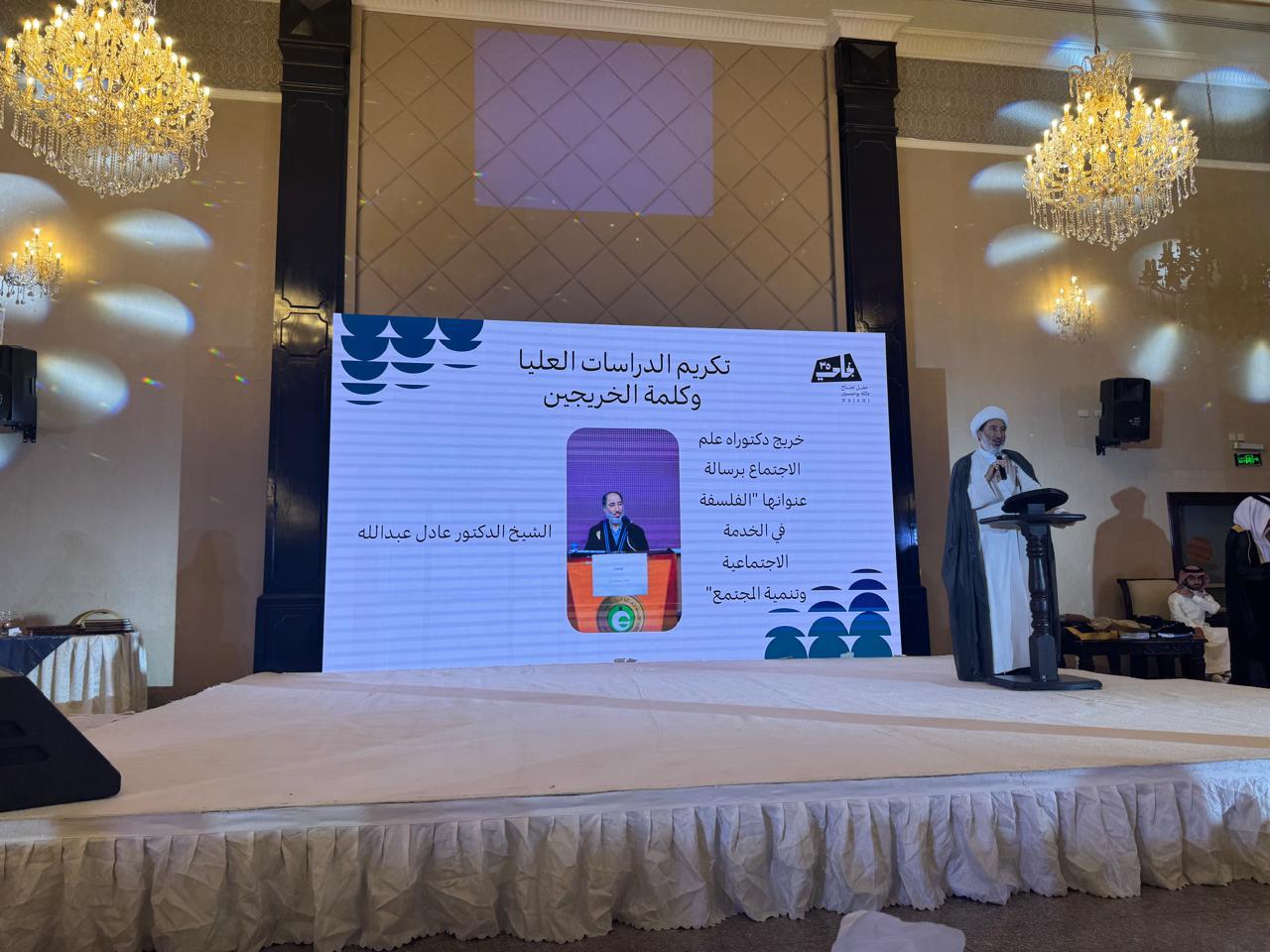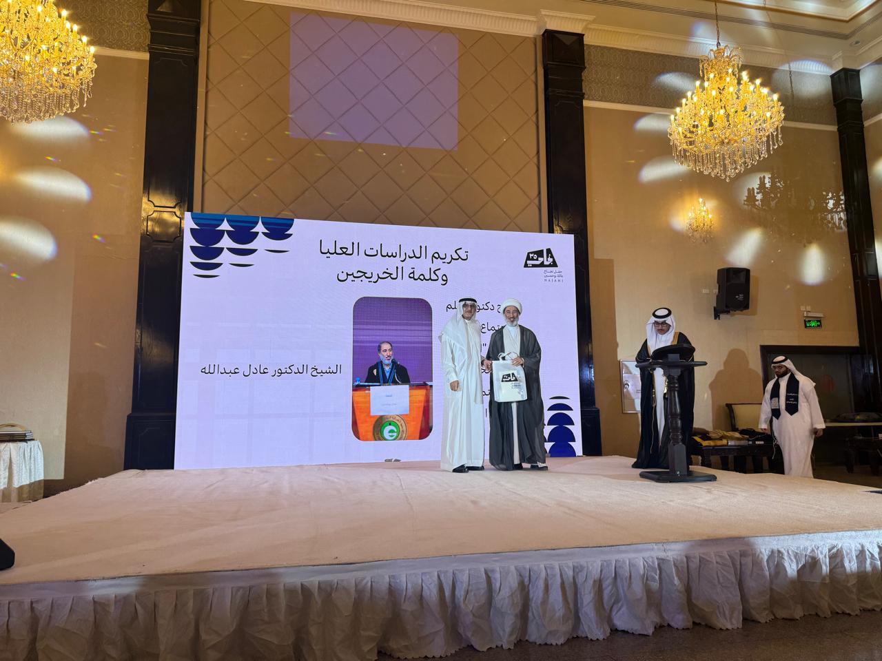 ومن ثم تم تكريم طلاب الدراسات العليا (الشيخ الدكتور عادل بوخمسين – د علي عبد الله محمد بوخمسين – د عبد الله حسن تقي بوخمسين – د محمد عبد الهادي البقشي) تقديرًا لجهودهم البحثية. وقد تم تكريم [الشيخ الدكتور عادل بوخمسين] من قبل البروفسور صدقي بوخمسين. والقى الشيخ د عادل كلمةً هنأ فيها الطلاب على تميزهم، وتم تكريمه من لجنة الحفل.