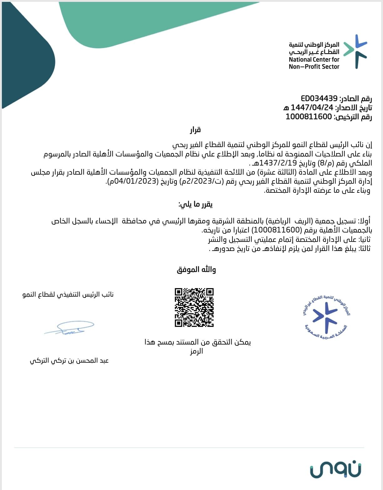 صدرت – بفضل الله وتوفيقه – موافقة المركز الوطني لتنمية القطاع غير الربحي على تأسيس جمعية الريف الرياضية بالأحساء برقم التصريح (1000811600) وتاريخ 24 / 04 / 2025م، وذلك تحت إشراف وزارة الرياضة.