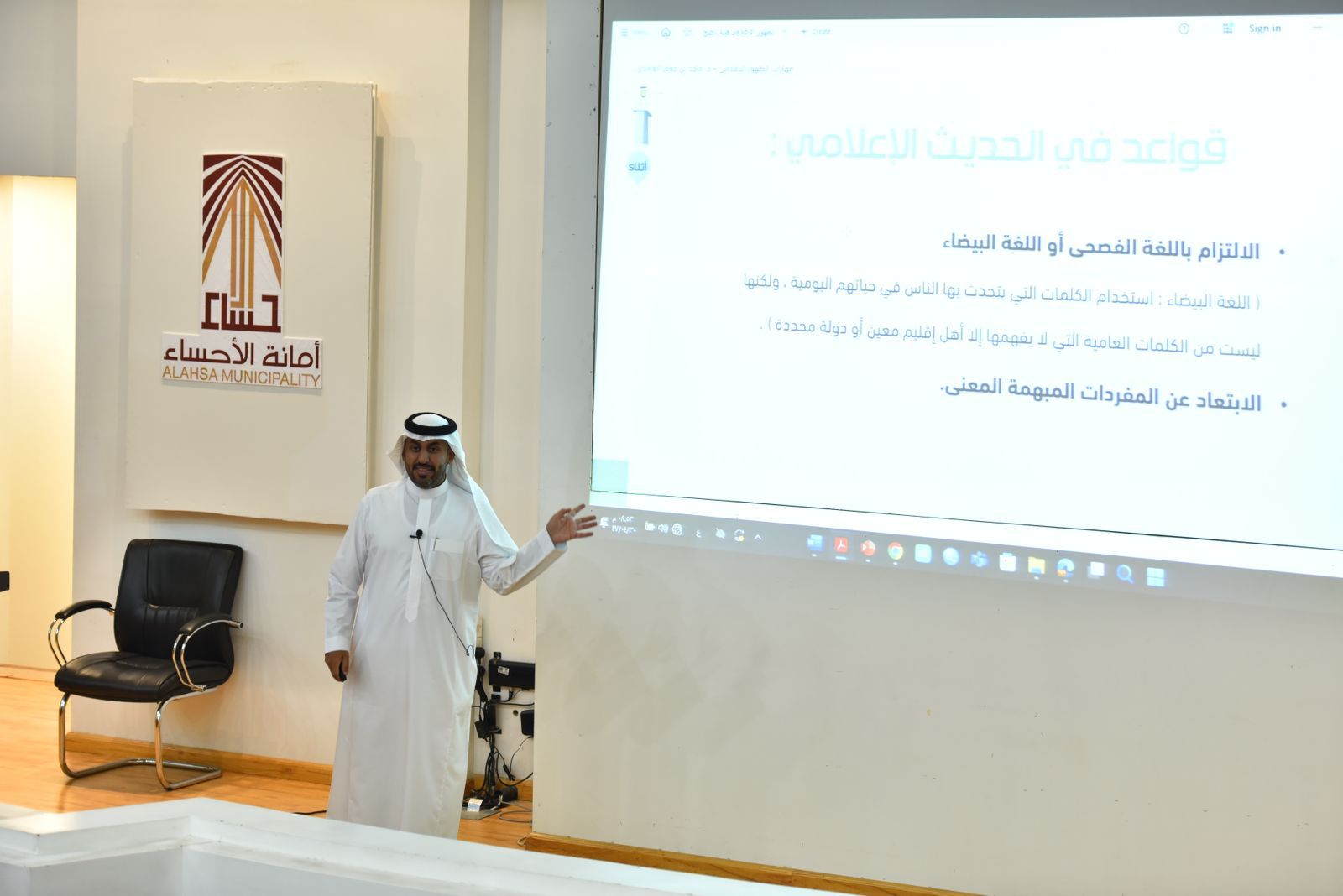 كما شدد على أهمية نطق الأصوات من مخارجها الصحيحة، ومراعاة التنغيم والنبرة ومواضع الوقف والوصل بما يتناسب مع الموقف الإعلامي.
