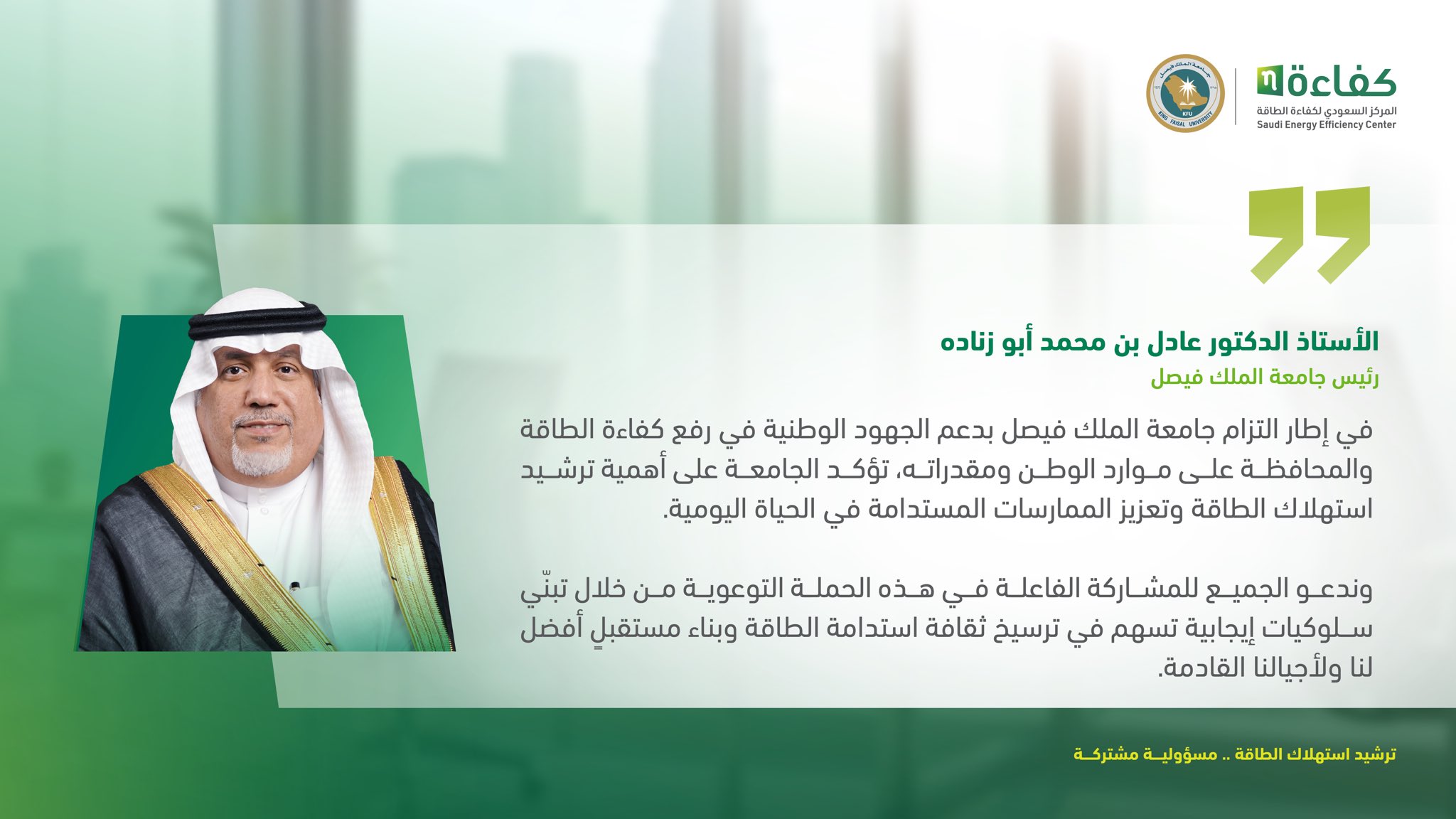 أكد الأستاذ الدكتور عادل بن محمد أبو زنادة، رئيس جامعة الملك فيصل، التزام الجامعة بدعم الجهود الوطنية في رفع كفاءة الطاقة والمحافظة على موارد الوطن ومقدراته، في إطار دورها المجتمعي ومسؤوليتها تجاه تعزيز الاستدامة البيئية.