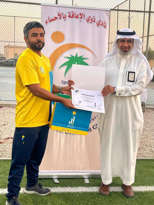 وفي ختام الفعالية، قدّم إداري نادي الجيل الأستاذ محمد الرويشد شهادة شكرٍ وتقدير إلى الرئيس التنفيذي لنادي ذوي الإعاقة بالأحساء الأستاذ خالد القرينيس؛ تقديرًا لمشاركته المميزة وتعاونه المثمر في إنجاح الفعالية.