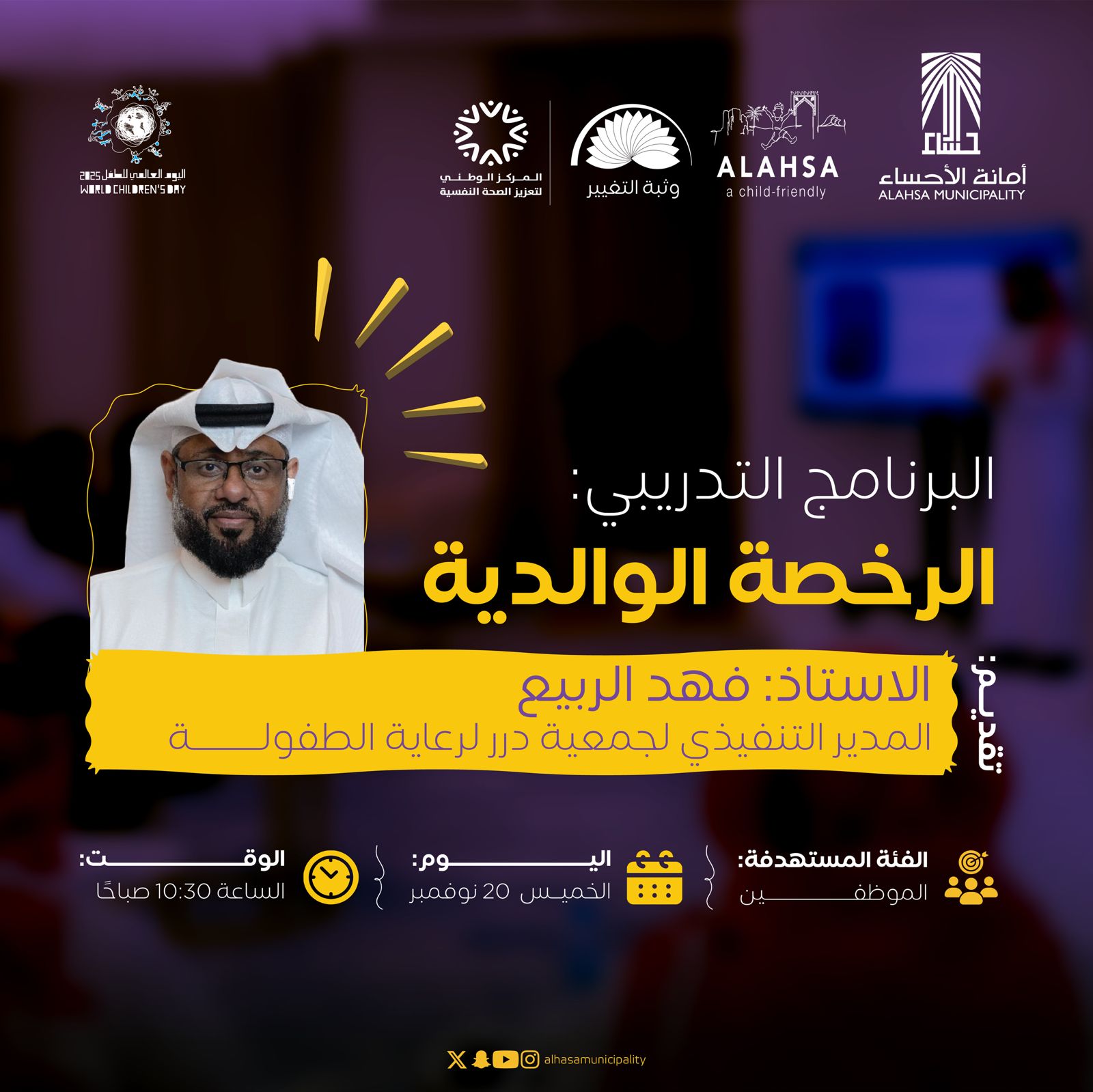 تستضيف أمانة الأحساء صباح يوم الخميس، أمسية تدريبية متخصصة بعنوان “الرخصة الوالدية”، يقدمها الأستاذ فهد عبدالرحمن الربيع، المدير التنفيذي لـ جمعية درر لرعاية الطفولة، وذلك ضمن فعاليات الاحتفاء بـ يوم الطفل العالمي.