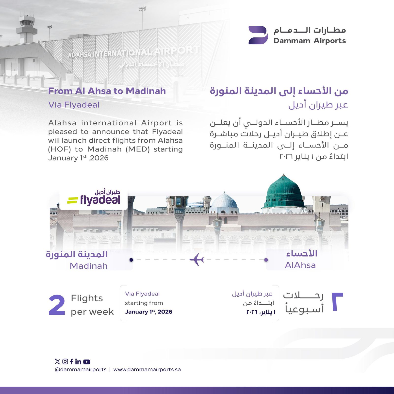 أعلن مطار الأحساء الدولي عن تدشين خط جوي جديد يربط بين الأحساء والمدينة المنورة عبر الناقل الوطني طيران أديل، وذلك من خلال رحلات مباشرة منتظمة تبدأ من 1 يناير 2026.