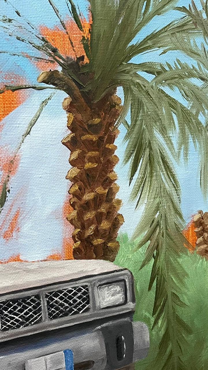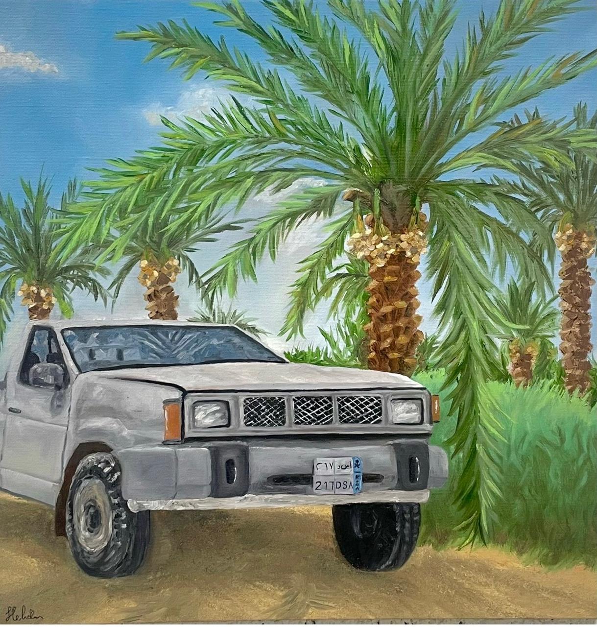 وبينت الفنانة أنها استخدمت انعكاسات النخيل على زجاج سيارة قديمة – ترمز إلى جمال الحياة البسيطة والتقاليد الزراعية العريقة في الأحساء -، لتمنح المشهد عمقًا بصريًا وإحساسًا أقرب للواقع، ودمجت الضوء والظل وحركة النخيل لتخلق إحساسًا حسيًا ومكانيًا، يعكس التراث ويعيد حكايات البيئة الأحسائية.