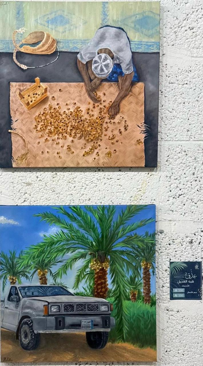 درست تكوين النخلة بعناية، وشاركت في النسخة الثانية من معرض “عِذْق” الذي تنظمه مجموعة “كلنا رسامون” في جمعية الثقافة الفنون بالأحساء، بلوحة فنية تهدف إلى إبراز عنقود التمر “العِذْق”، وهو جزء من النخلة يحتوي على مجموعة من الشماريخ وظيفتها حمل ثمار التمر من نموه وحتى نضجه، كرمز للحياة الزراعية والوفرة في الأحساء.
