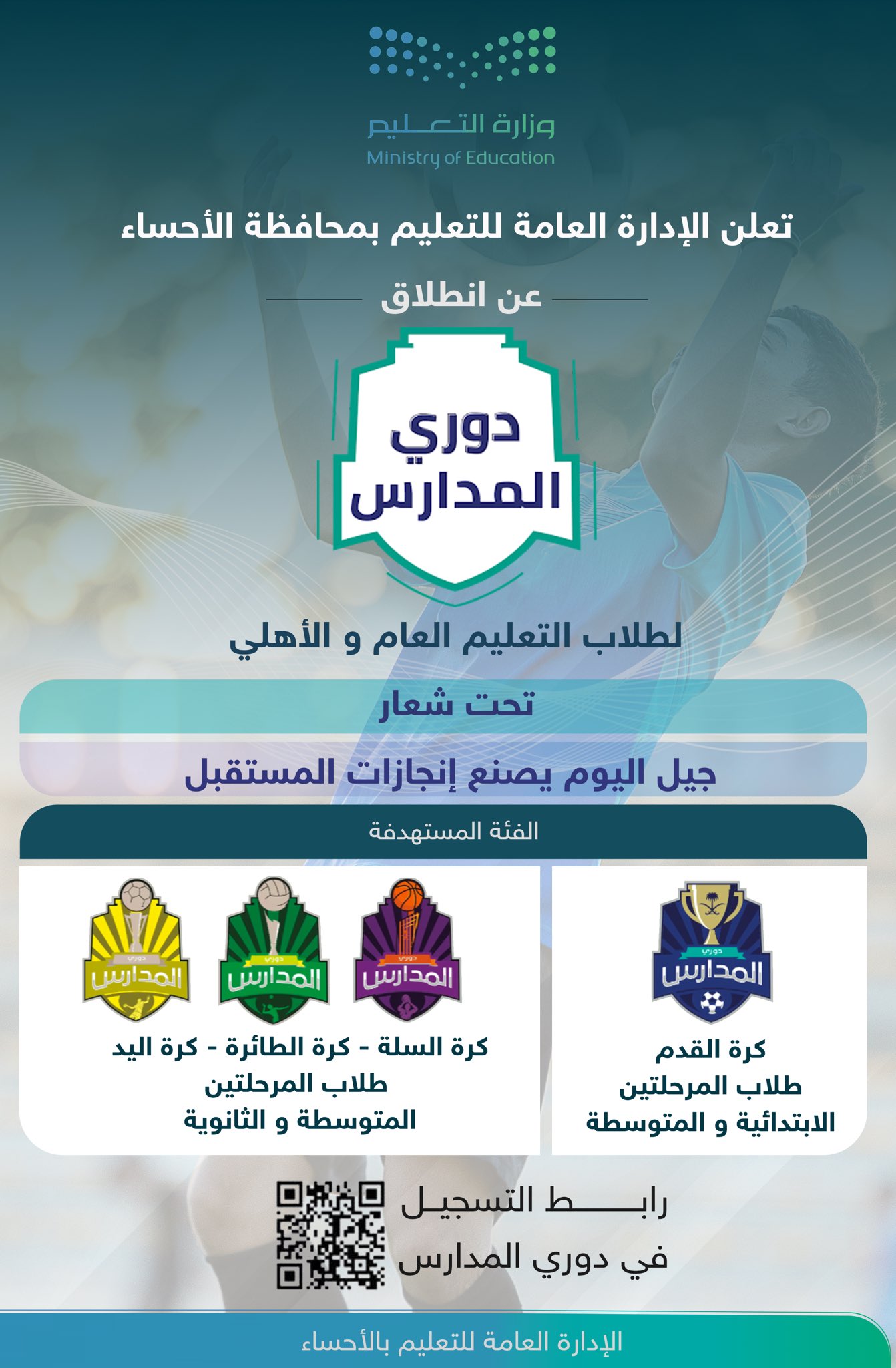 أعلنت الإدارة العامة للتعليم بمحافظة الأحساء عن انطلاق منافسات دوري المدارس لطلاب التعليم العام والأهلي، وذلك في إطار جهودها لدعم الأنشطة الرياضية وتعزيز المشاركة الطلابية في مختلف الألعاب.