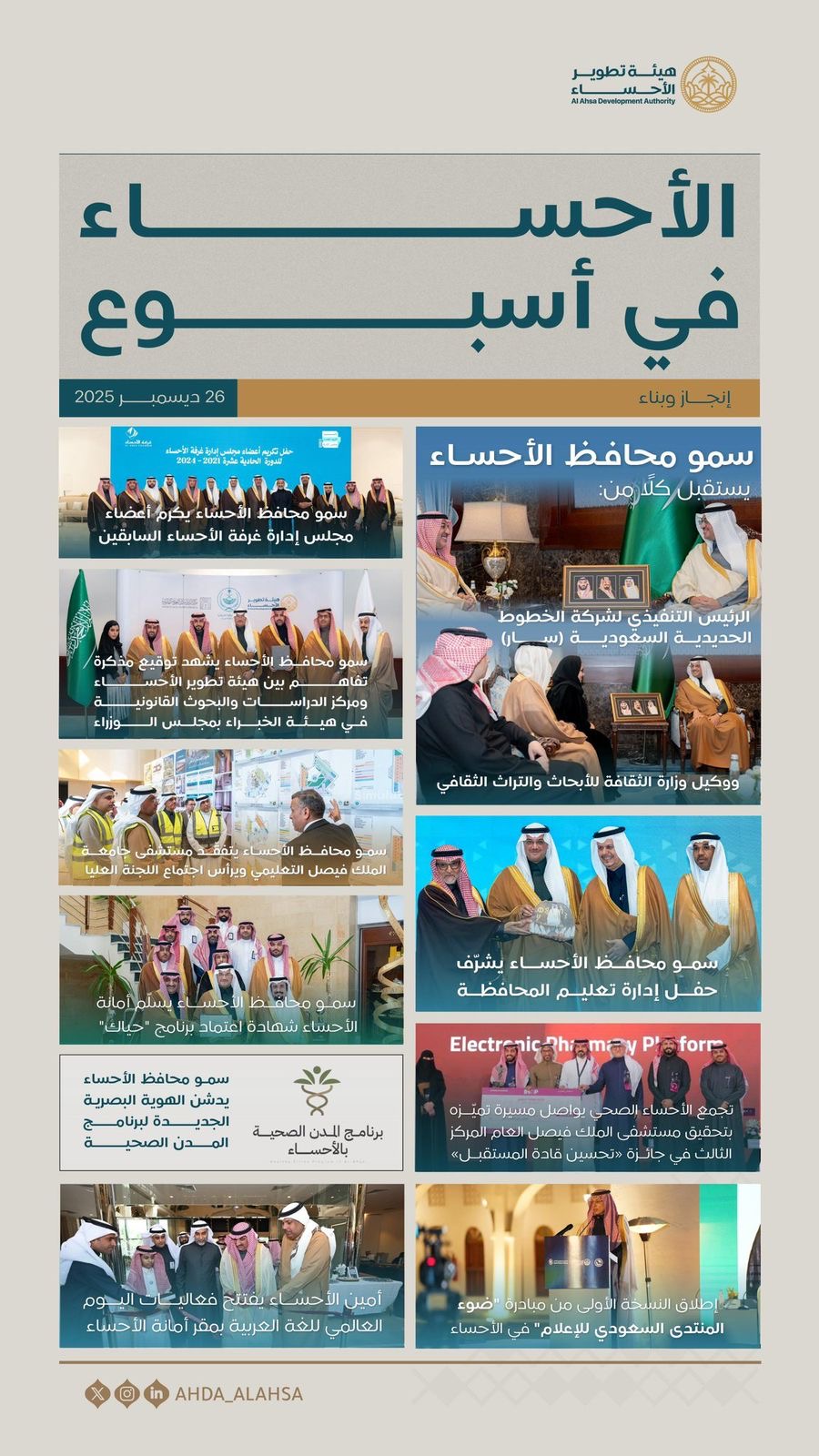 شهدت محافظة الأحساء أسبوعًا حافلًا بالمنجزات النوعية والفعاليات المتنوعة، عكست حراكًا تنمويًا متسارعًا، وتكاملًا بين القطاعات الحكومية والخاصة، بحضور ومتابعة كريمة من صاحب السمو الملكي الأمير سعود بن طلال بن بدر محافظ الأحساء.